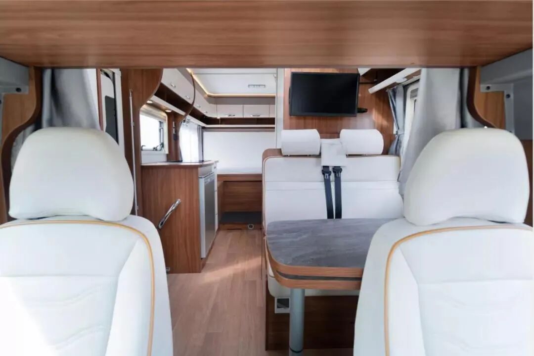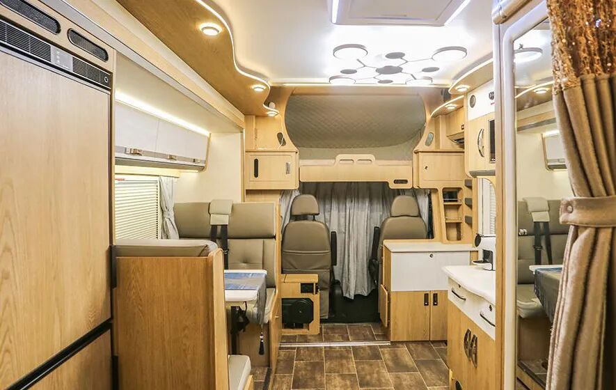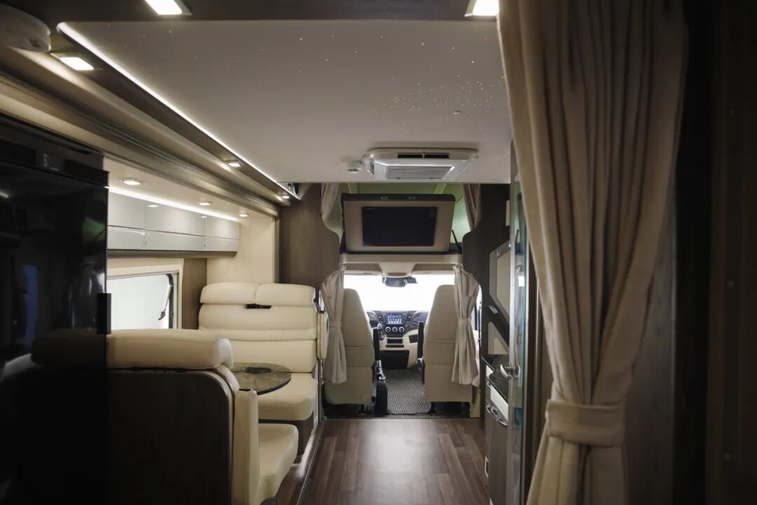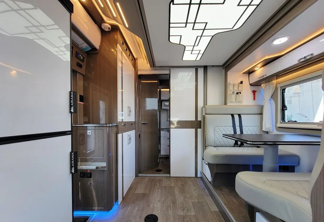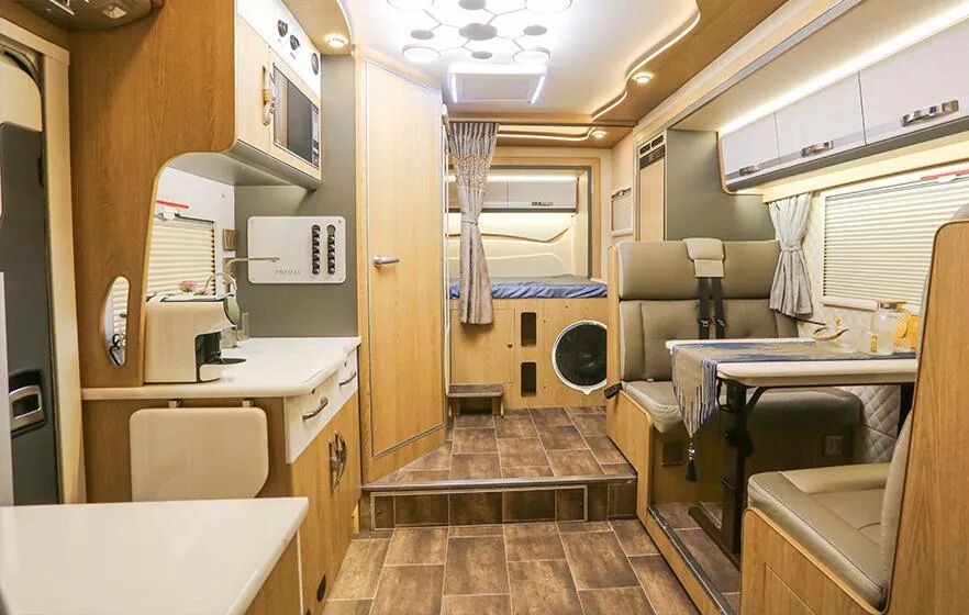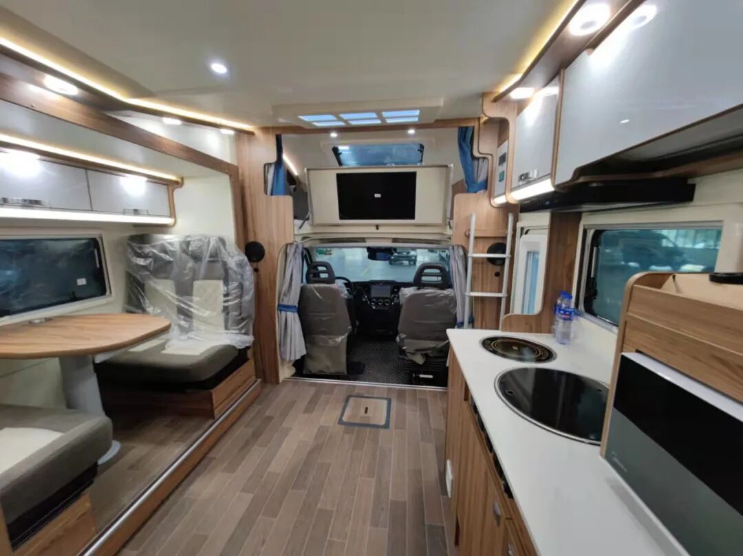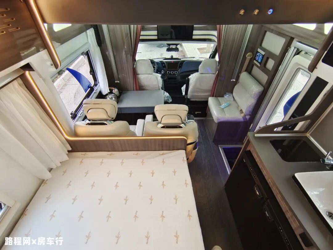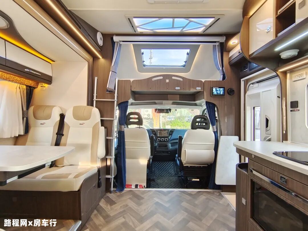 驾驶舱与后方车厢贯通式的设计方便日常进出,过道上方搭载车载电视;额头处内置双人床;生活区装饰上较为豪华,空间通透明亮,并配置了大量高端家具,底部铺设木质纹理高端地板,顶部氛围灯带+暖色系照明灯,共同营造温馨舒适的旅居环境;