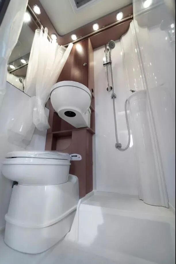 独立卫浴间在车内中部位置,内部配备了Thetford盒式坐便器、淋浴间进口防水折叠门、高档木质防水底托、可移动洗漱池、旋转水龙头等,空间利用巧妙;
