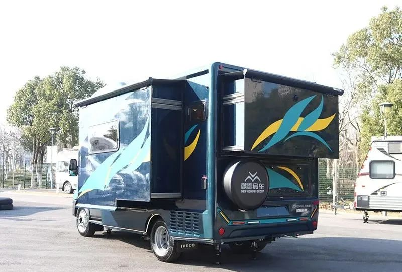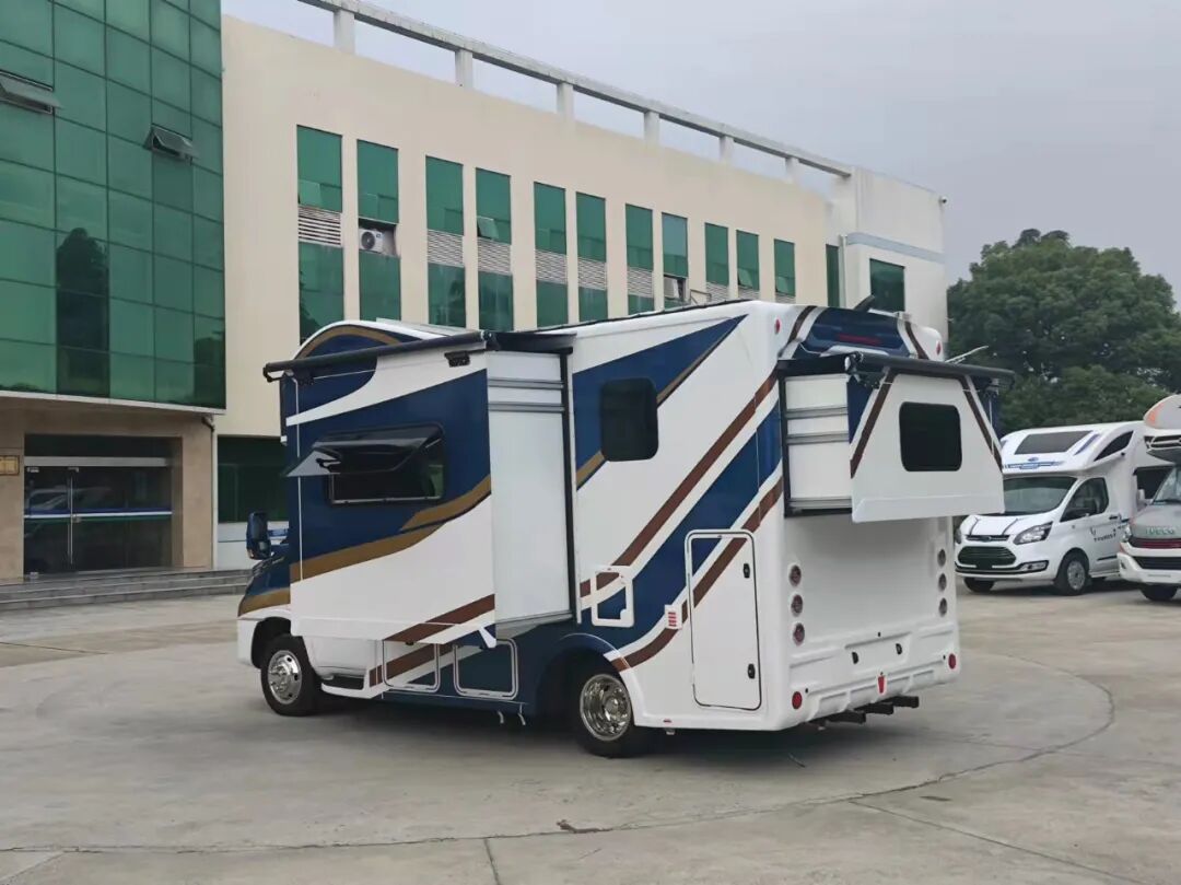 车外设有户外厨房、户外遮阳棚、外置储物舱等设施;动力方面搭载3.0T柴油发动机,最大170马力,峰值扭矩400N·m,匹配8AT变速箱方便驾驶操控;整车长度保持在6米内,满足蓝牌C照的驾驶要求;