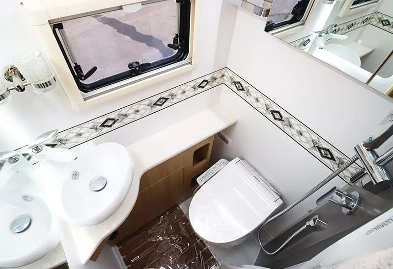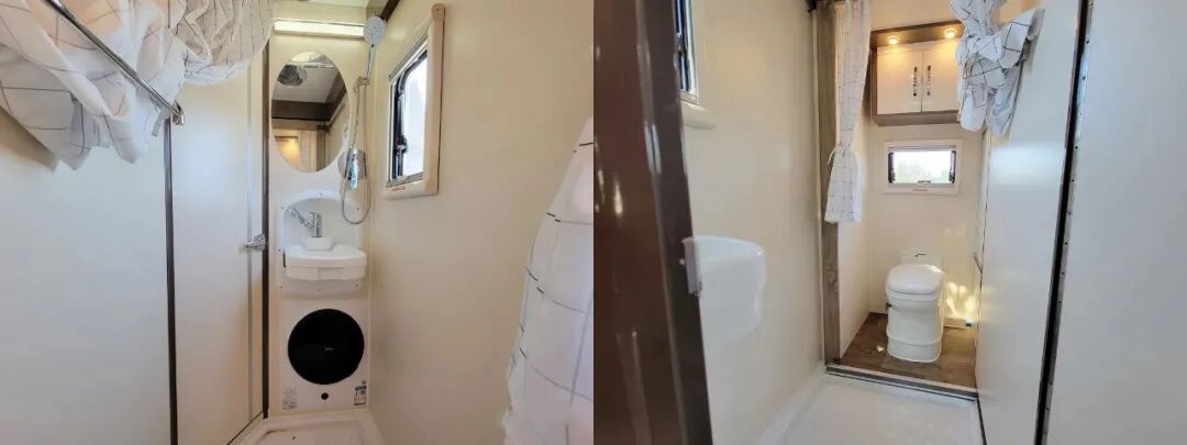 卫浴间一体式设计,配备赛特福德抽拉盒式马桶、独立洗漱池、独立淋浴花洒、镜面柜、换气扇、进口迷你洗衣机等,满足车上人员日常卫浴洗漱需求;