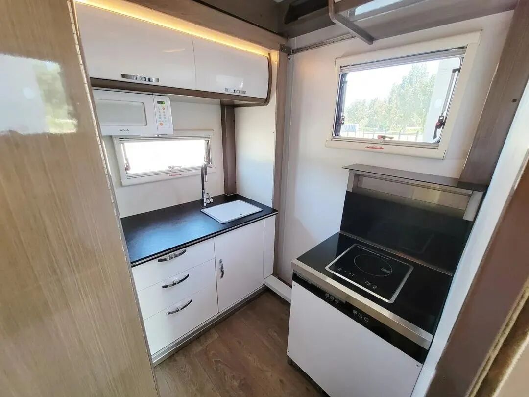 厨房区一体式橱柜侧方设有折叠式拓展桌板,并配置了电磁炉、洗菜池、多美达110L冰箱、房车专用抽油烟机、微波炉等设施;