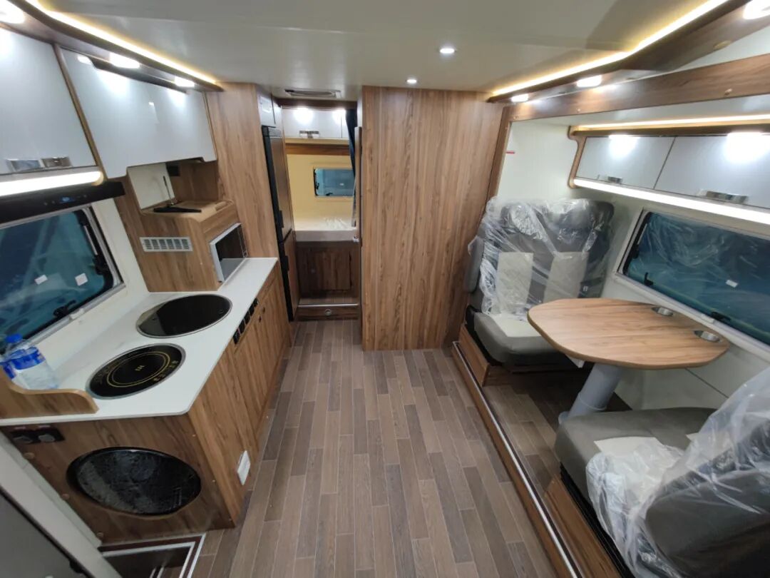 左侧会客区双人对卡座,中间设有升降式单腿餐桌,顶部多组储物吊柜;右侧厨房区配置了2000W电磁炉、房车专用抽油烟机、微波炉等,底部内嵌大宇洗衣机(带烘干);此外,卡座后方还有一台141L赛特福德双开门冰箱;