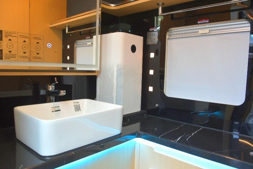 卫浴区在车尾部分,干湿分离设计,卫生间为封闭式,日常使用互不打扰;内部配置了科勒洗漱池、科勒水龙头、小米空气净化器、科勒镜柜、赛特福德旋转式坐便器、花洒套装、MAX换气扇等;