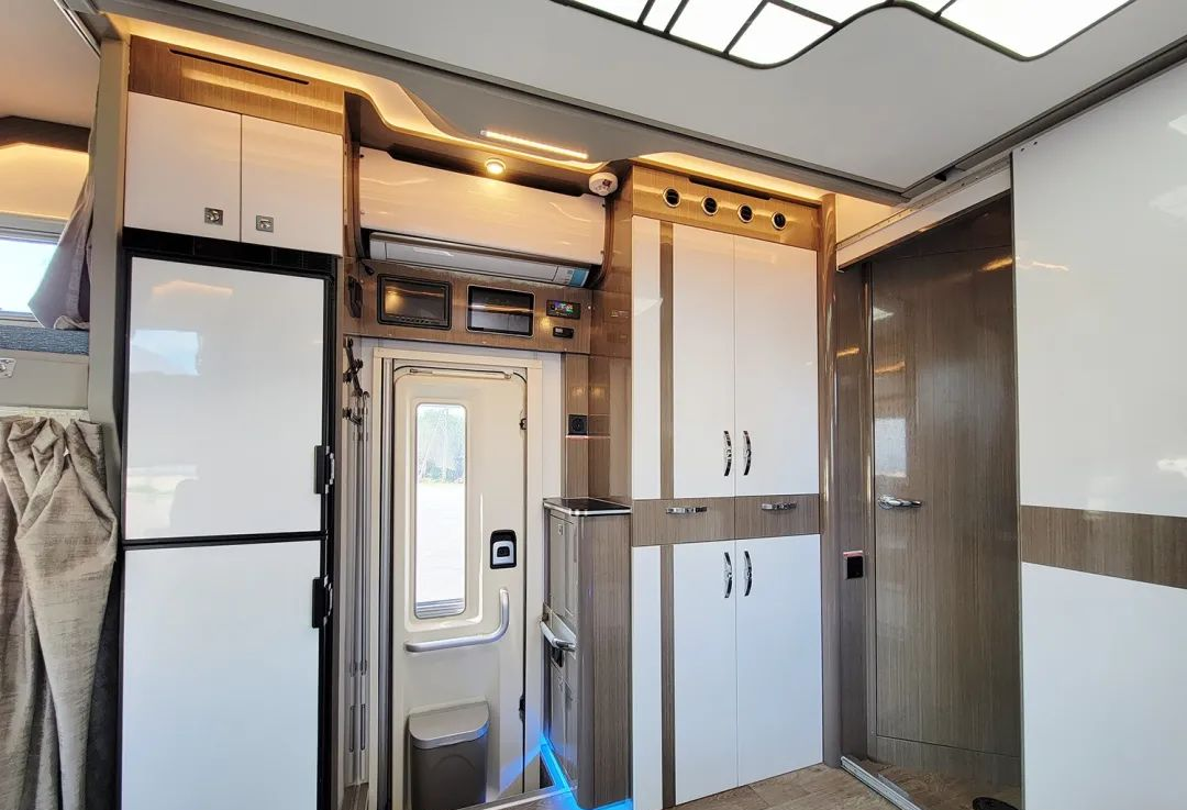 会客区相邻的位置设有房车专用双开门冰箱、储物柜、1.5P家用变频空调、总控面板、独立衣柜等设施,为旅居生活起居提供便利;