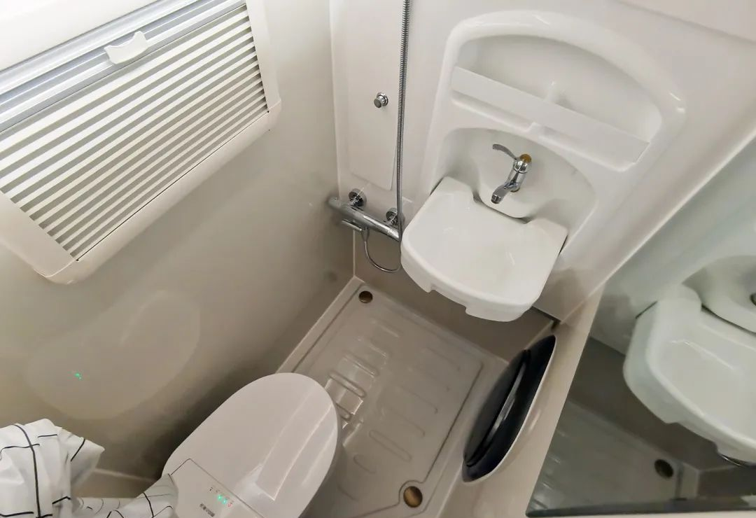 独立封闭式卫浴间做了干湿分离处理,内部配有洗漱池、房车专用盒式座便器、独立淋浴花洒、毛巾架、梳妆镜、浴帘、换气扇等设施;