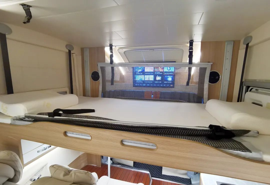 驾驶舱与后方生活区贯通式设计;上方搭载32英寸车载电视,乘客区设有四个进口扬声器;电视放下后便是额头休息区,额头床带爬梯、隔断帘、防护网,进口高端绒布包覆,内部空间可满足多人睡眠;