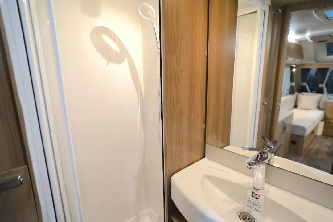 尾部卫浴区采用封闭式干湿分离设计,隐私性好,使用空间也非常充足;内部配备了卫浴柜(带独立水龙头、洗手盆)、赛特福德20L抽拉式马桶(带20L独立水箱)、特鲁马电器双用暖风热水系统、气电双能源模式热水器等设施,满足日常卫浴、盥洗需求;淋浴间紧邻卫浴柜,可独立使用。