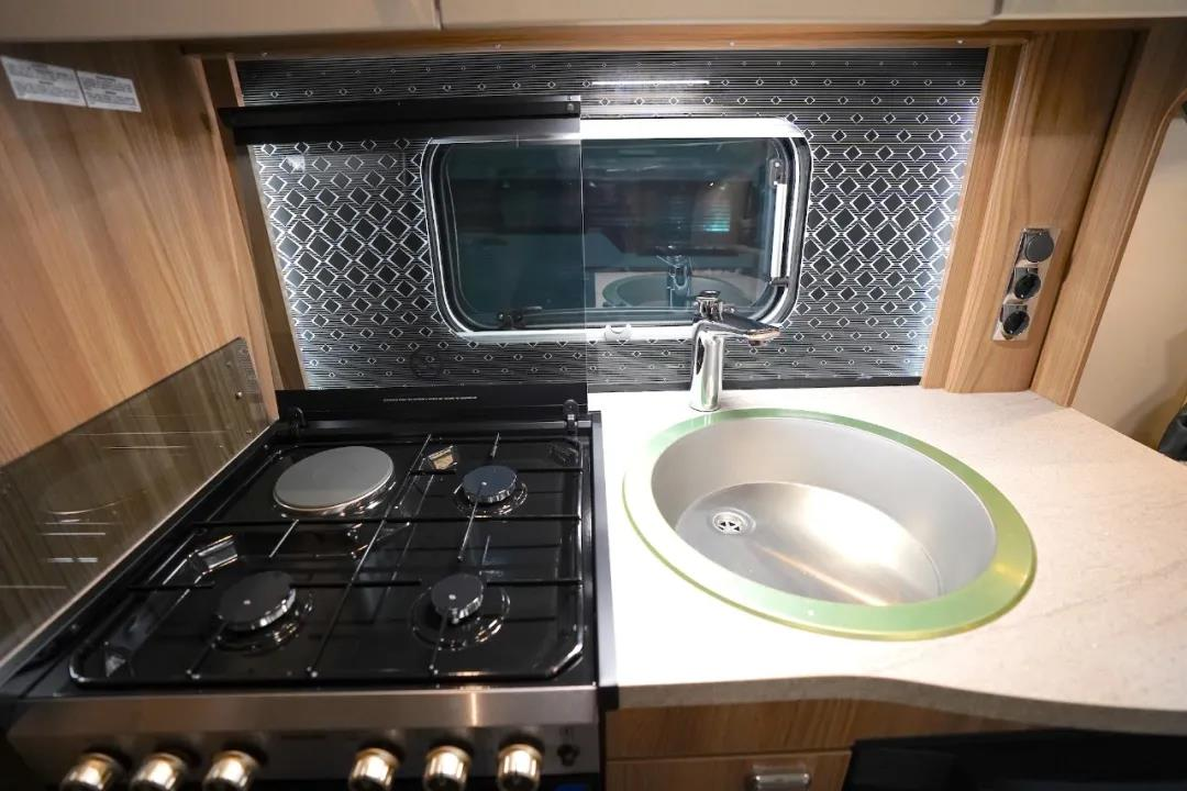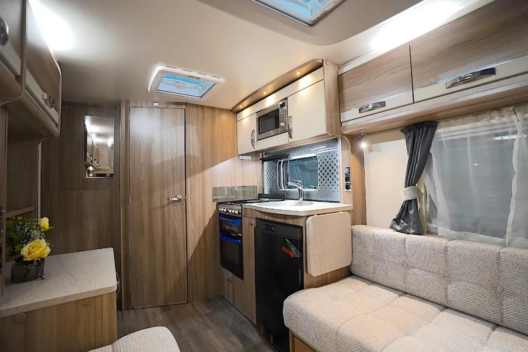 车身中部是厨房区,配备了微波炉、烤箱、洗菜池、独立水龙头、塞特福德集成灶等设施,满足日常烹饪所需;橱柜右侧设有折叠板,增加操作区使用面积;顶部配有储物吊柜,方便收纳厨房物品。