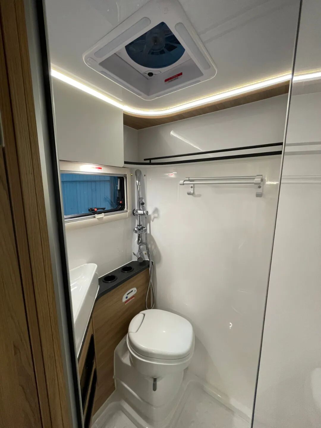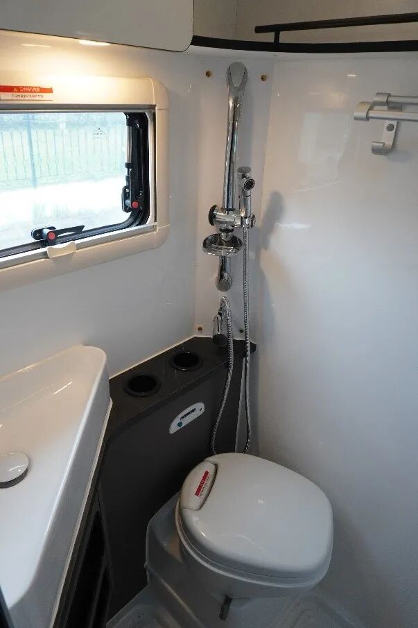 ● 卫生间设置在车厢尾部,卫生间设有淋浴花洒、浴室镜、毛巾架、置物架、双向排气扇,洗手盆,塞特福德的旋转马桶等卫浴必备设施;
