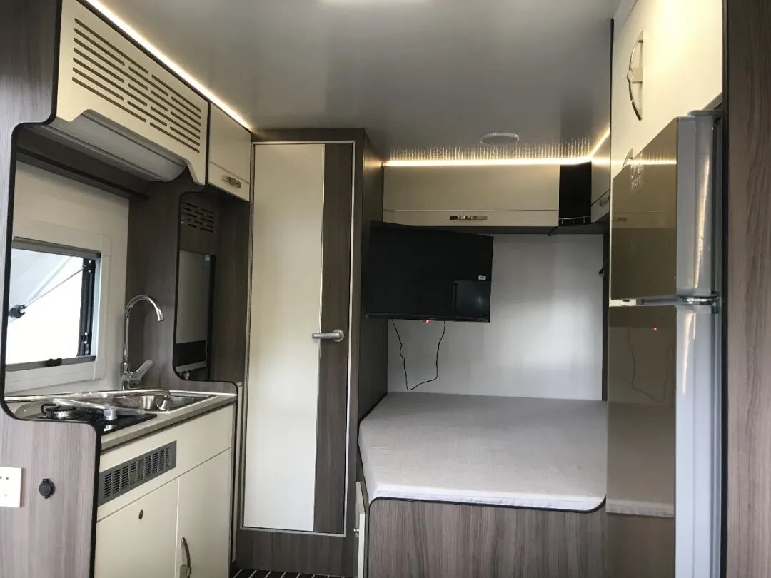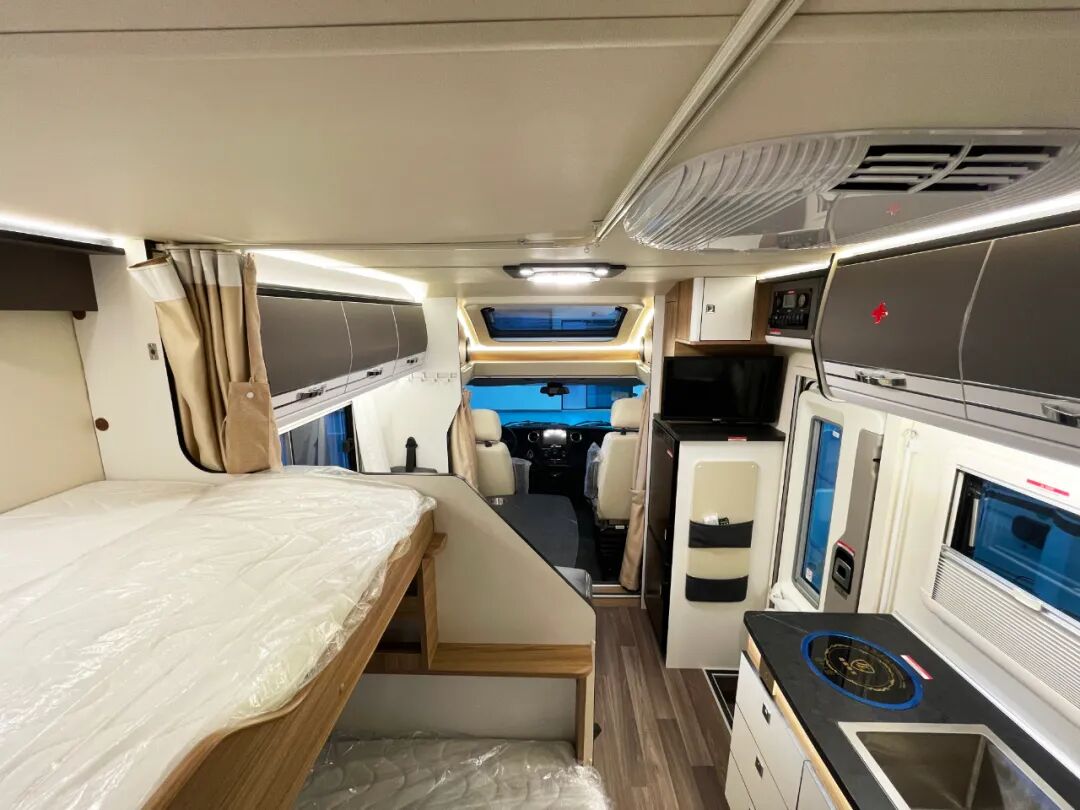 ● 前侧和左侧均配有外推窗,保证了采光及空气流通。两侧上方配有吊柜。娱乐设备方面配备一台32寸电视(可180度旋转);
