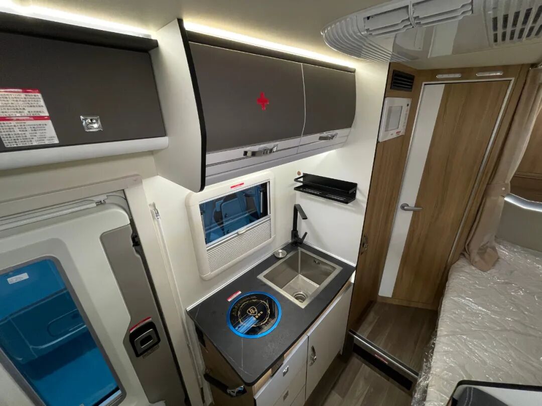 ● 水电方面,标配800AH的磷酸锂电池,180L清水箱,70L灰水箱,水箱都采用不锈钢制作表面都包有保温材质防腐防尘,车内搭载3000W充电逆变智能一体机,整车搭载360倒车影像和行驻车监控。