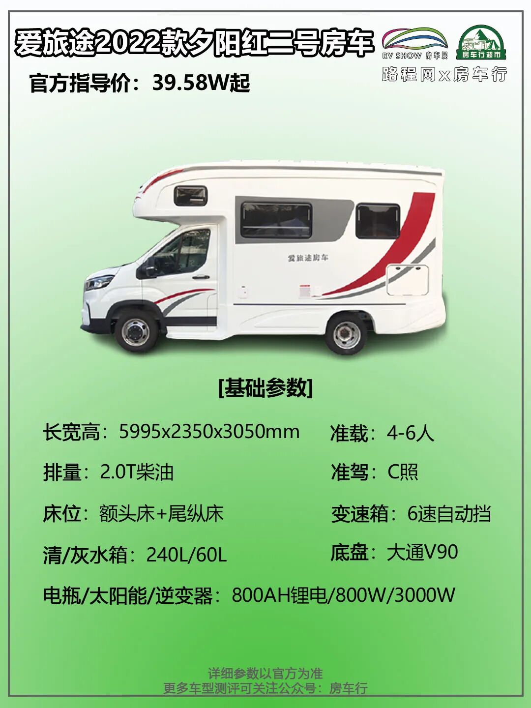 综合来看,爱旅途2022款夕阳红二号C型房车各项配置都很齐全,水电配备也很充足,内部的隐藏式储物空间、插座、阅读灯等细节设计,更是提升了旅居生活的品质。目前,这款房车的官方指导为39.58W起,大家觉得这款房车怎么样呢,欢迎评论区下方留言!