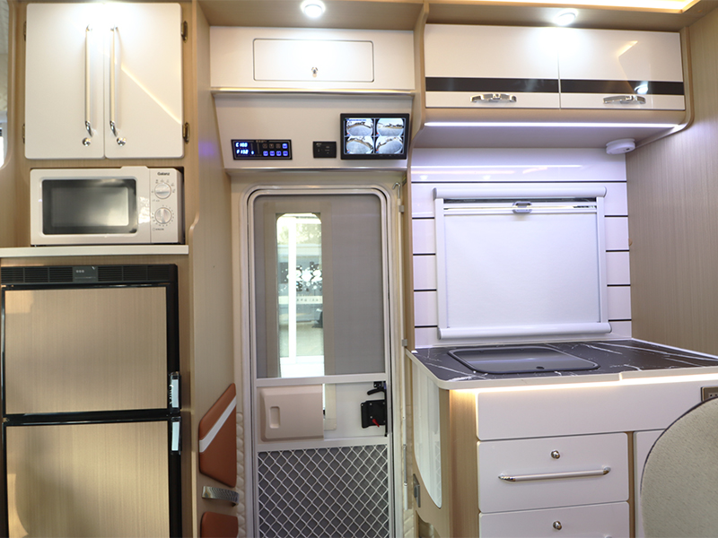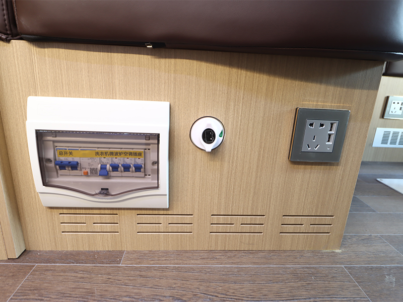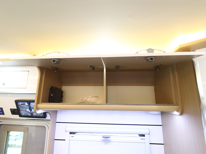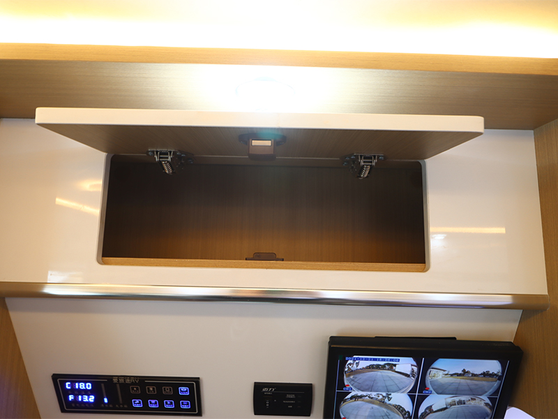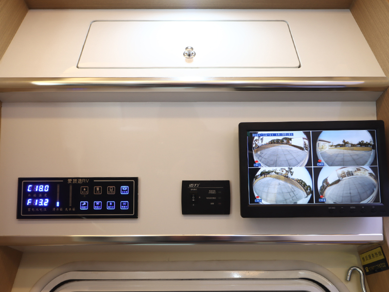 吊柜左侧是整车的水电集成控制面板,可实时了解并调控车内用水用电情况;右侧是四路监控,用于观察房车四周情况;控制面板上方还有一个小的储物空间。