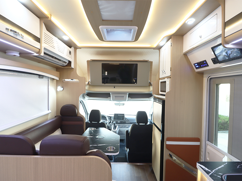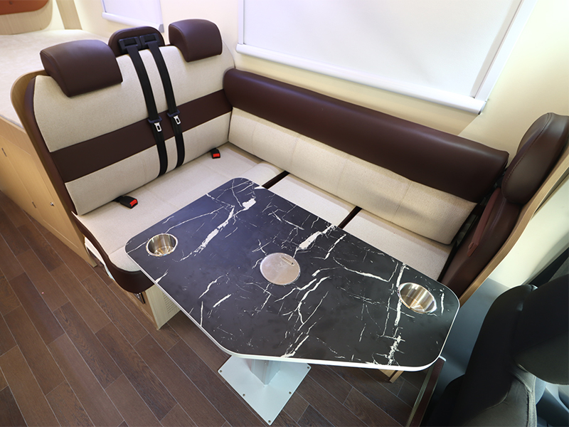 驾驶室后方是会客区,采用L型沙发卡座布局,乘坐空间更宽敞;双人沙发带有安全带,保证行车时乘坐安全;卡座中间配备手动升降茶几,供日常就餐、聊天使用;顶部配有12V换气扇(灯光+遮阳+防蚊),加强车内空气循环。