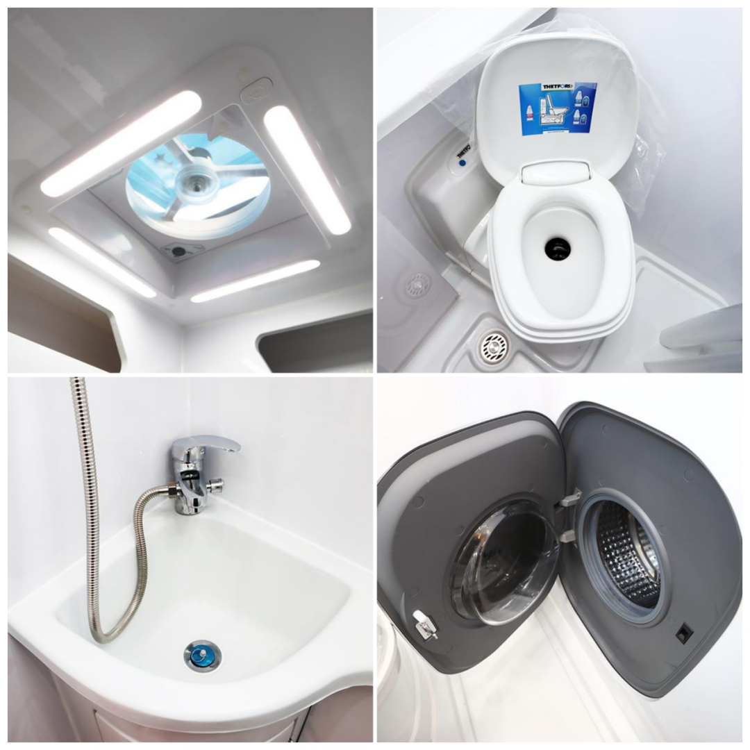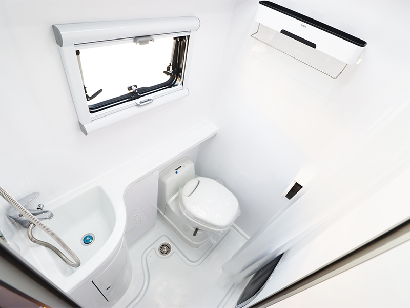 侧面设有外推窗,和顶部双向换气扇搭配,可快速更新卫生间空气;日常洗漱配备了豪华洗手池,右侧是塞特福德盒式马桶,空间利用率更高;马桶旁边还内嵌了一台3kg全自动滚筒洗衣机,解决户外洗衣问题。
