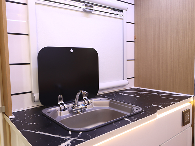 厨房区位于会客区对侧,分为储藏区、操作区两部分;操作区采用一体式橱柜设计,配备了折叠带盖的冷热水龙头,不使用时盖上盖子,作为厨房操作台使用;右侧设置了五孔电源插座,方便使用电器产品。