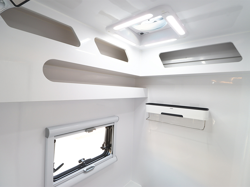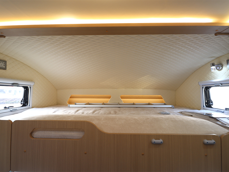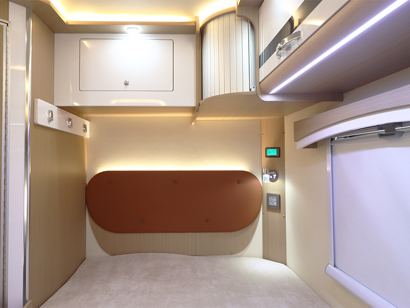 额头区位于驾驶室上方,设有一张2100x1300mm床铺,供日常休息使用;床的侧面设有阅读灯、USB接口、五孔插座、外推窗,满足照明、采光通风等需求。
