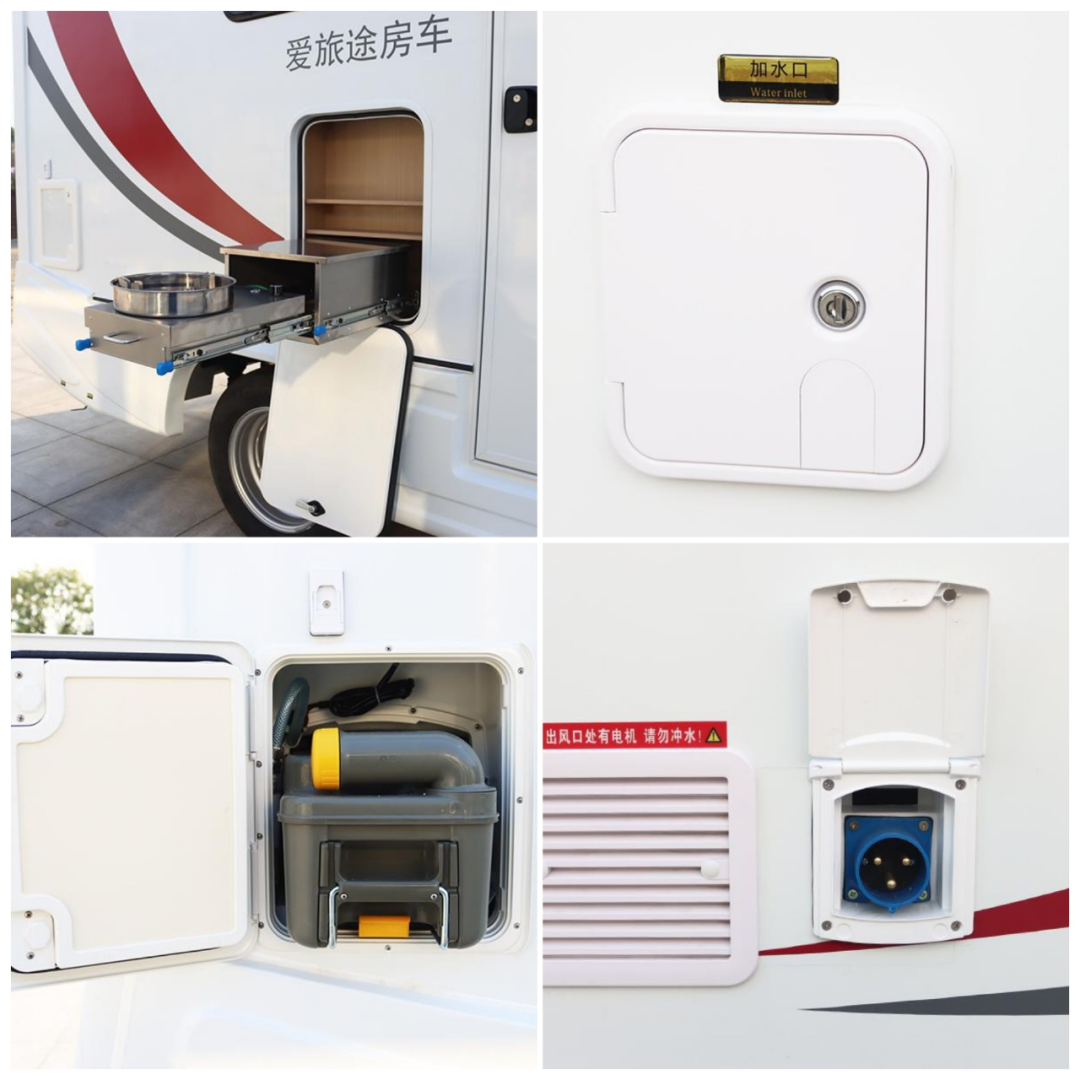 车身外侧配备了手动遮阳棚、乘客中门(带纱网)、注水口、外插市电接口(16A/15米线缆)、电动踏步、12V led室外照明灯(防水)等设施,满足驻车时户外生活所需。