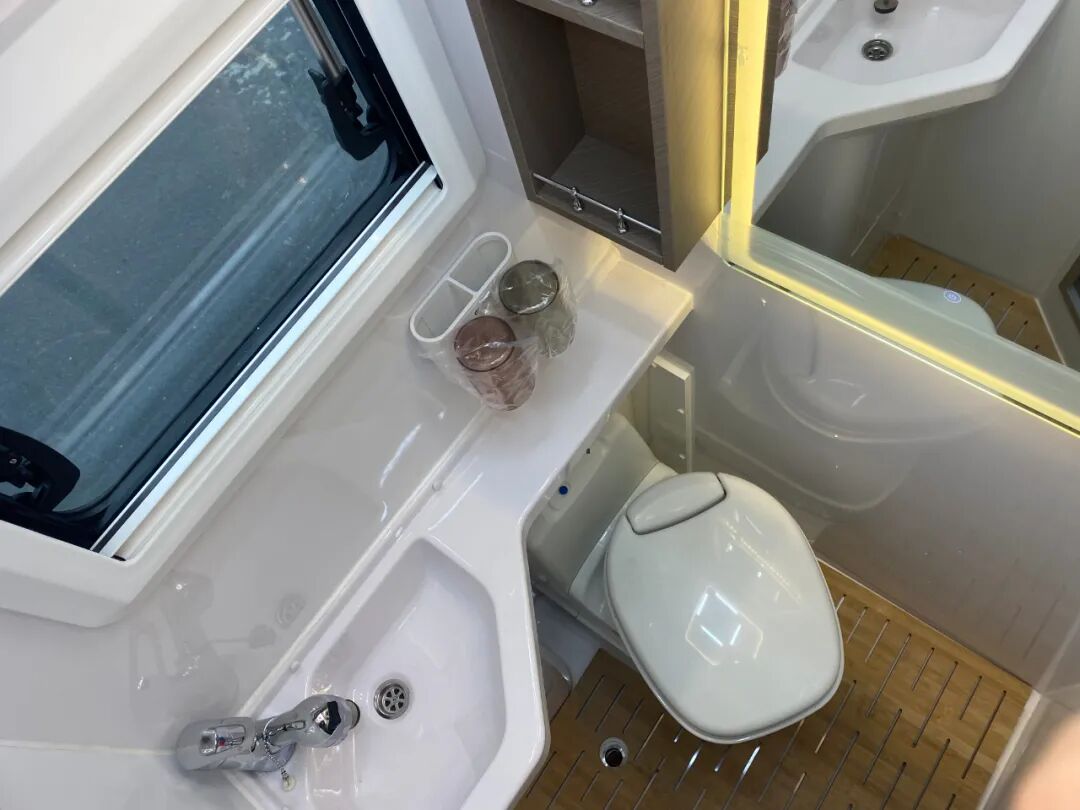 独立卫浴区采用干湿一体式设计,内部配备了进口塞特福德盒式C200马桶、独立水龙头、花洒、化妆镜(带暖光灯)、洗手池等设施,满足日常洗漱、卫浴需求;地面铺设定制版竹木防滑底座,防止洗浴时滑倒;卫生间内配有柴油加热器,洗浴时打开可提升卫生间温度。