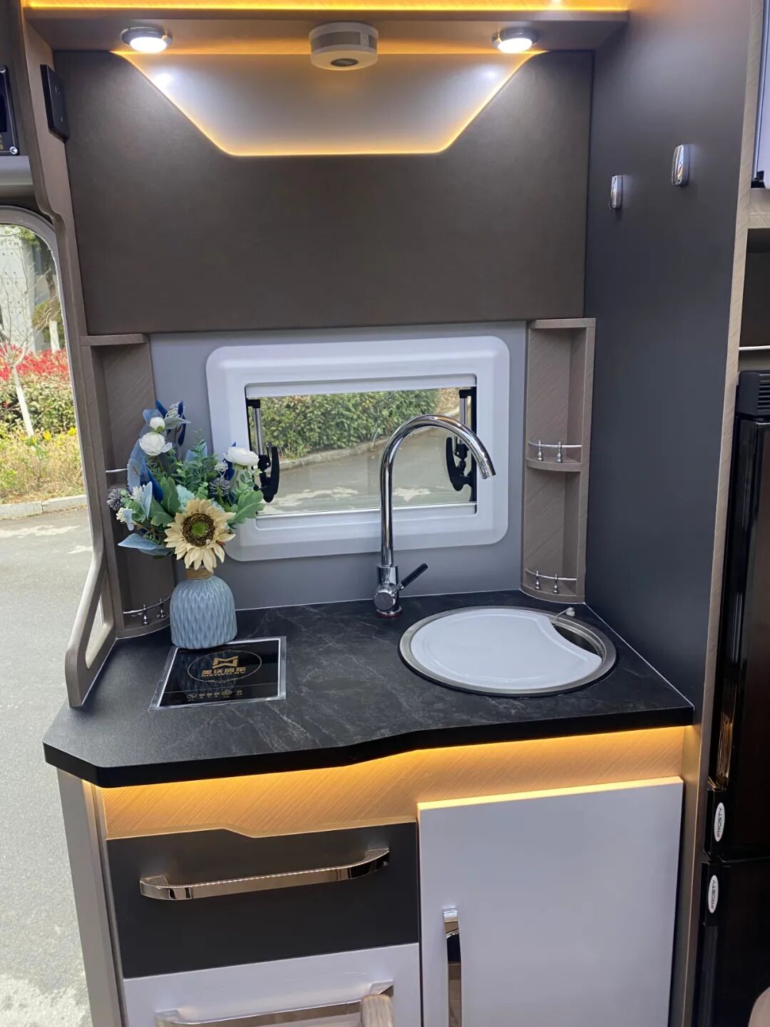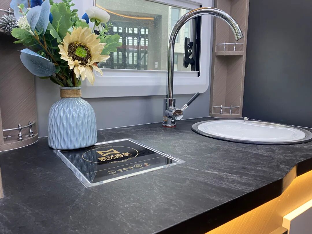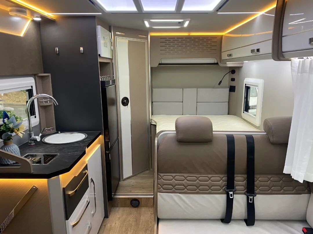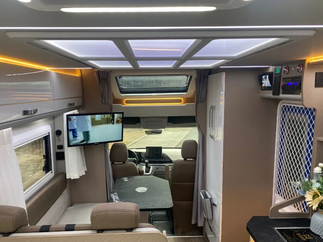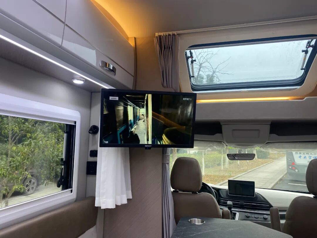 驾驶室后方是整车的生活区,采用轻量化环保板材,环保无异味,符合绿色健康的生活理念;照明系统采用会客区星空吊顶氛围灯、白色照明灯和金黄色氛围灯组合,既保证了车内照明,又增添了温馨、柔和的氛围;通风系统配备了格力家用空调、房车换气扇,娱乐系统可选装车载KTV。