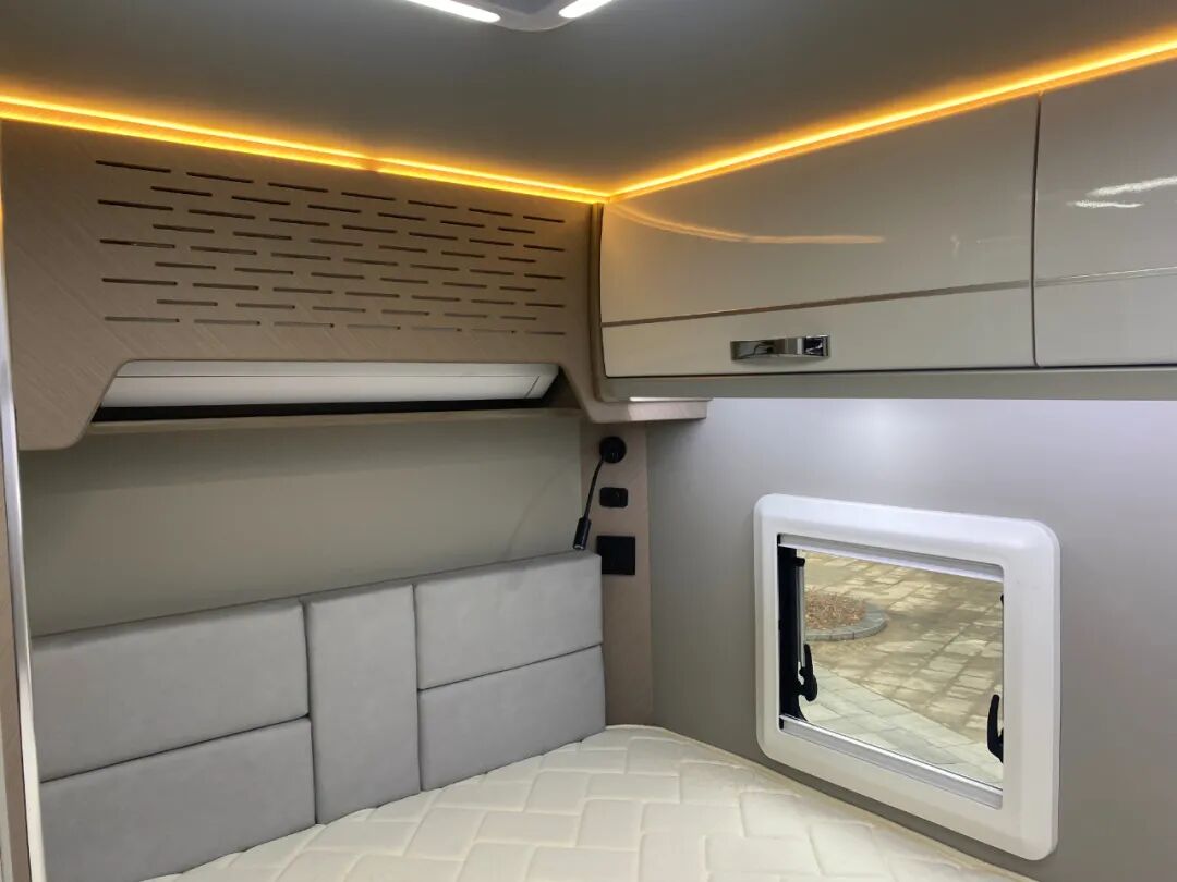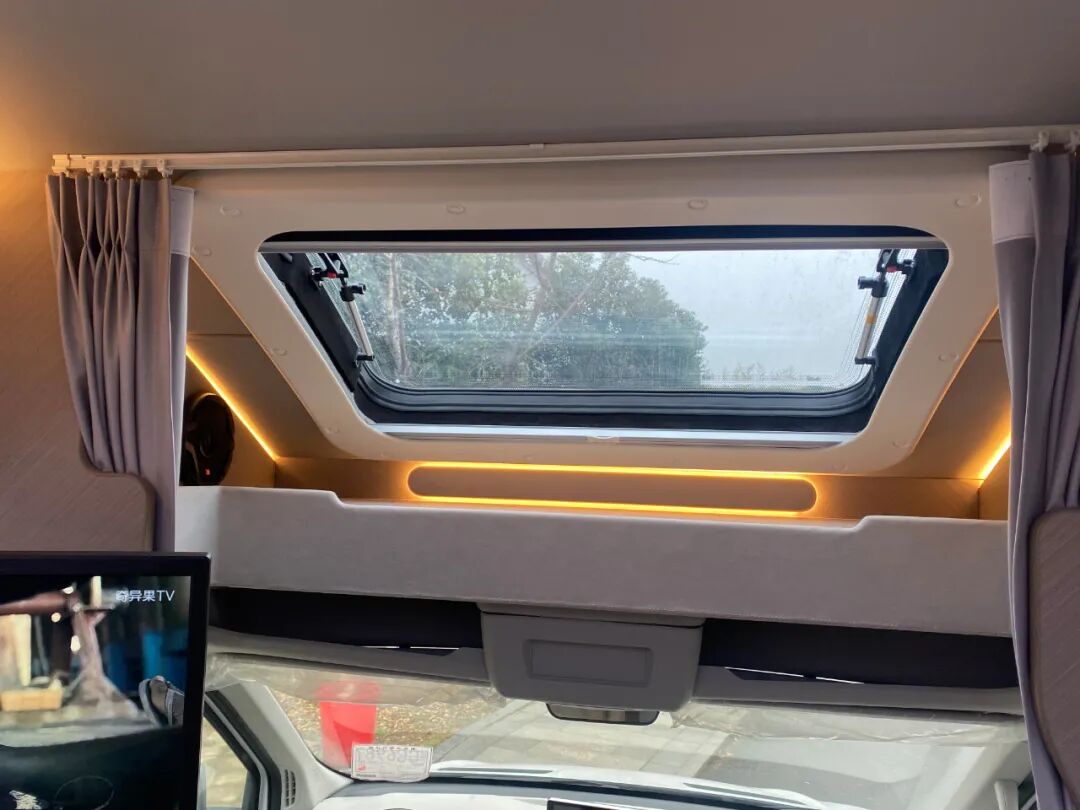 由于采用小额头设计,美沃大通V90小额头房车的额头区无法满足睡眠需求,但可作为储存空间,存放旅行物品;该区域还设有金黄色彩灯,夜间拿取物品也非常方便;顶部还设有江苏三乔大尺寸天窗,方便日常采光通风。
