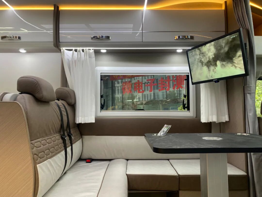 会客区位于驾驶室后方,采用L型沙发卡座布局,空间利用更充分,休息空间也更充足;双人沙发带有安全带,保证行车时乘坐安全;中间设置了一张方形餐桌,供日常就餐使用;上方位置还可加装电动吊床,增加车内睡眠空间。