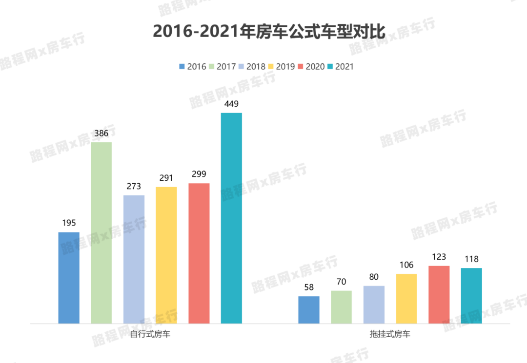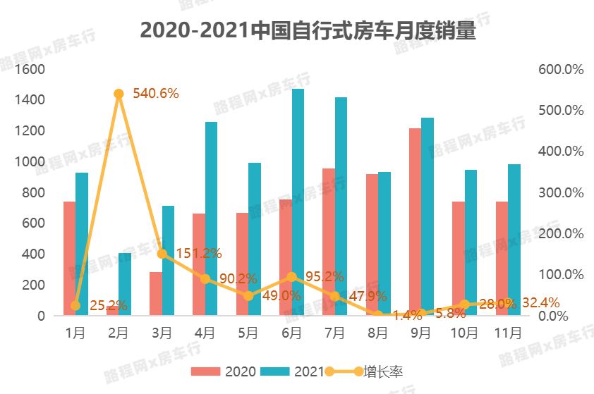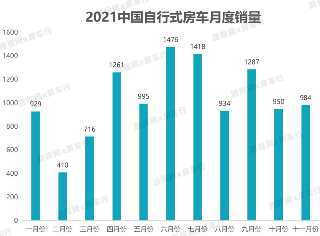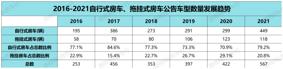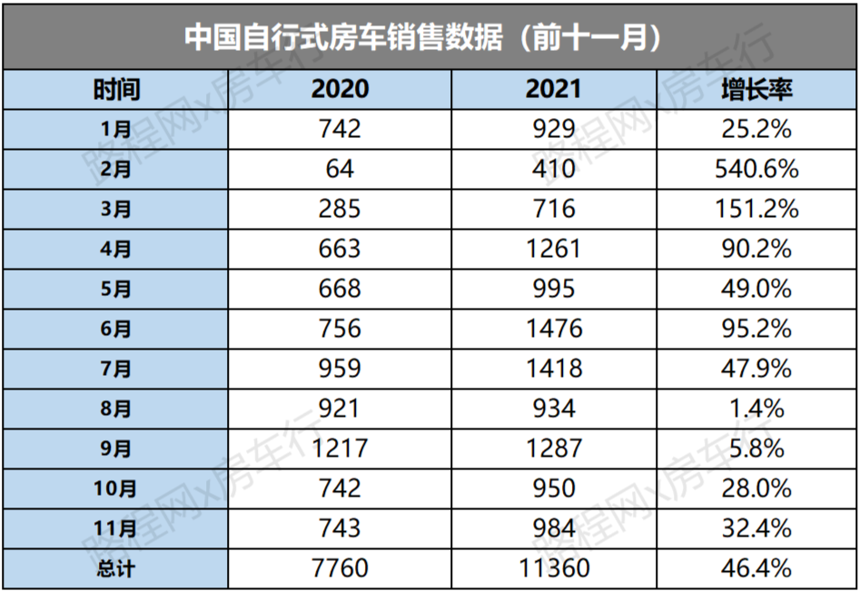根据路程网x房车行相关数据统计显示:2021年全年共有182家房车企业申报567款新车,其中包含449款自行式房车与118款拖挂式房车;而在销售数量上,2021年1月-11月,国内自行式房车销售数量由2020年的7760辆飙升至11360辆,同比增长46.4%;2021年中国自行式房车年度销量(前十一月)、全年公示车型数量双双突破新高。