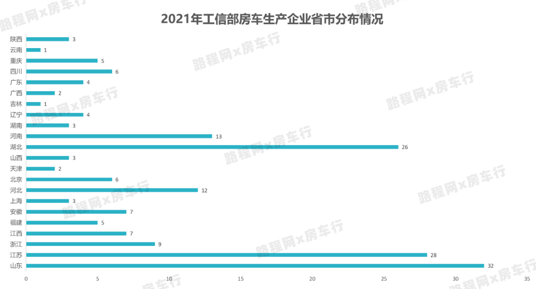 而在各省市分布数量上,排名前三的依次为山东 (32家)、江苏(28家)、湖北(26家);新兴企业的涌现为行业带来更多的发展活力,头部企业的优势表现得更加明显,未来国内房车市场的发展潜力依然值得期待。
