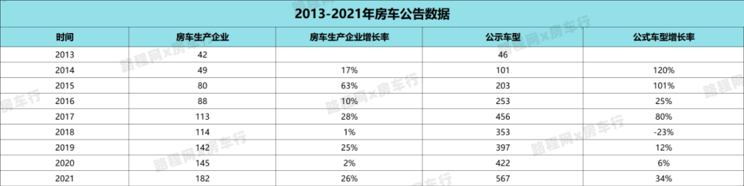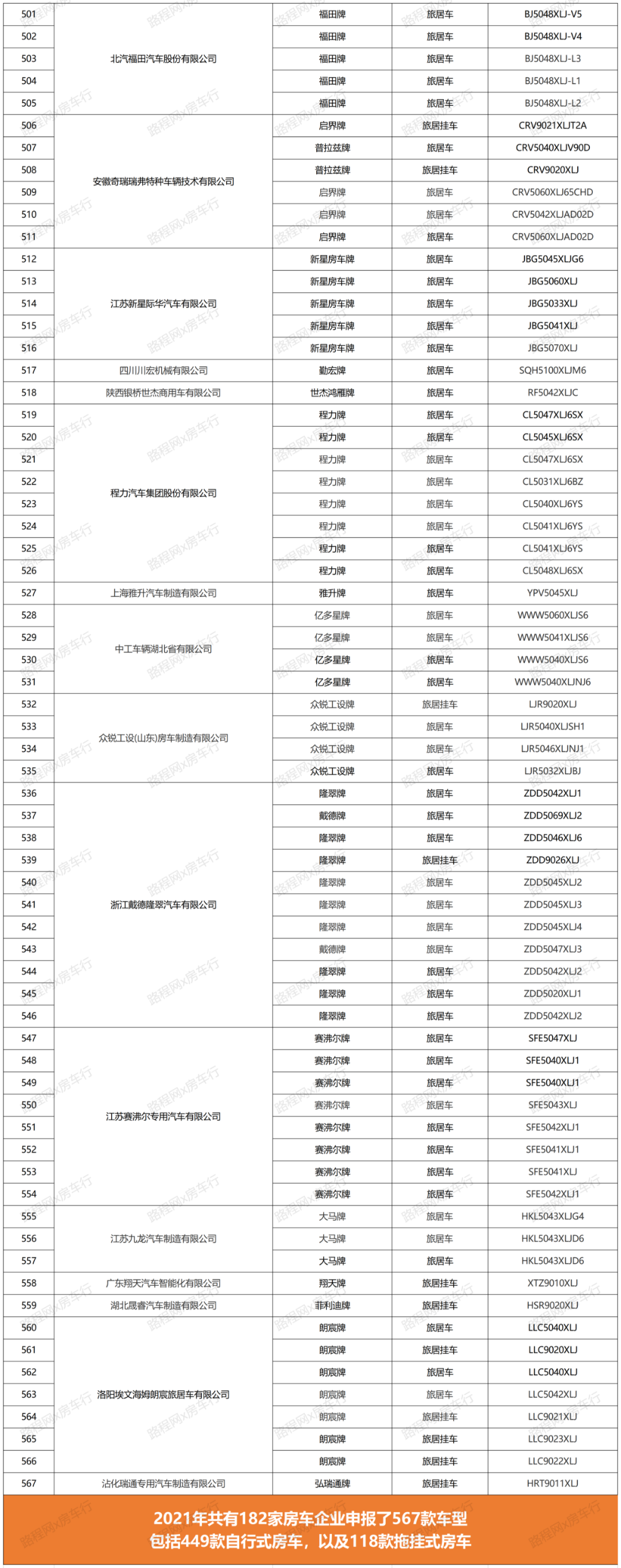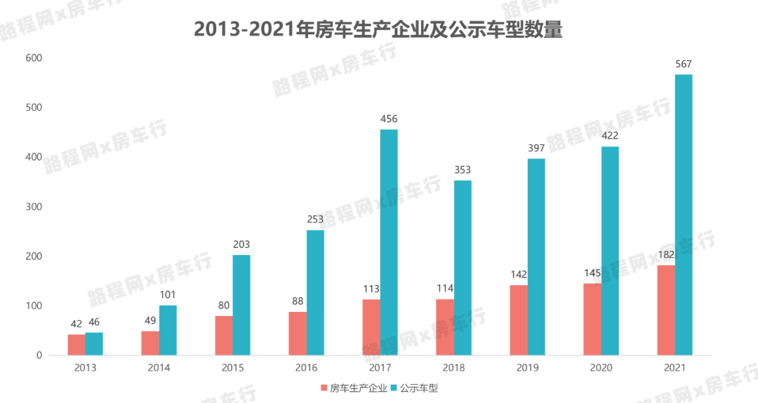 从工信部2021年发布的新车型公告来看,2021年全年共有182家房车生产企业申报567款房车,相较2020年的145家房车生产企业申报422款房车来说,房车生产企业同比增长26%,公告车型数量同比增长34%;越来越多的改装厂家加入到房车的生产制造行列中来,未来房车市场的竞争或将更加激烈。