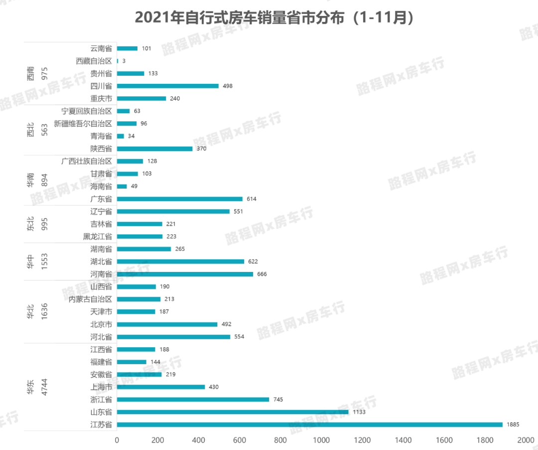 而在2021年1-11月自行式房车销量省市分布上,江苏省以1885辆的销售数据荣获断层第一,山东省则以1133辆的销量排名第二,而其它省市,如浙江省(745辆)、河南省(666辆)、湖北省(622辆)、广东省(614辆)、河北省(554辆)、辽宁省(551辆)、四川省(498辆)、北京市(492辆)、上海市(430辆)等也都有着不错的表现。