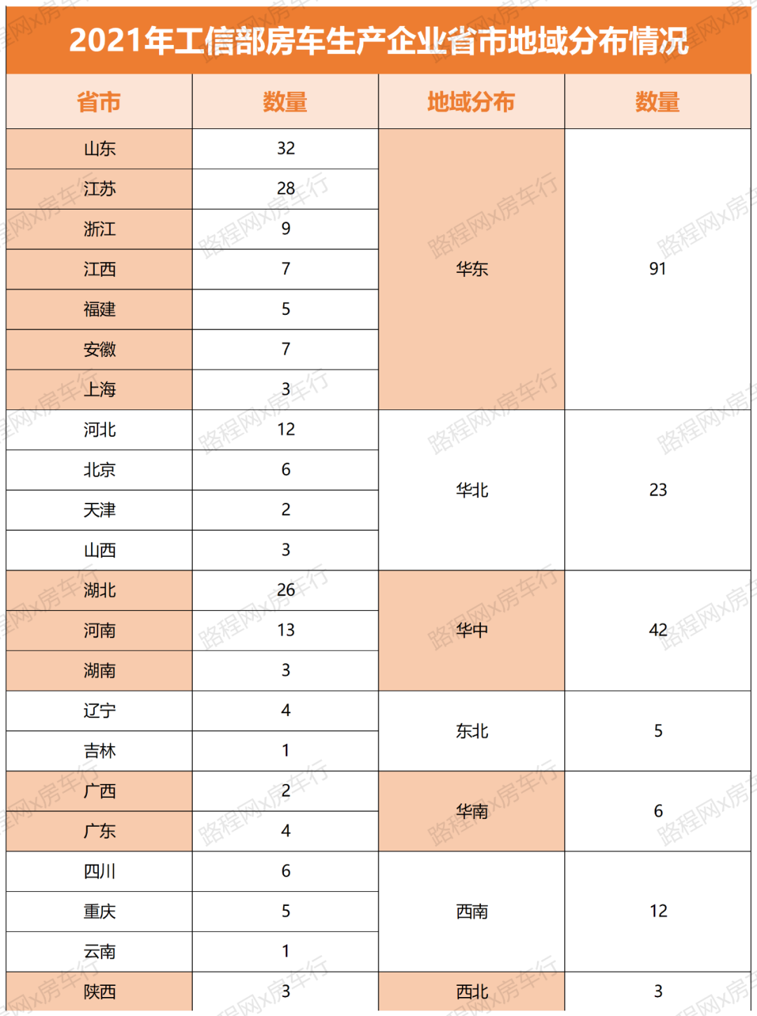 另外,从房车生产企业的地域分布情况来看,以山东、江苏为代表的华东地区,以湖北、河南为代表的华中地区及以河北为代表的华北地区仍是房车生产企业的主要阵地。