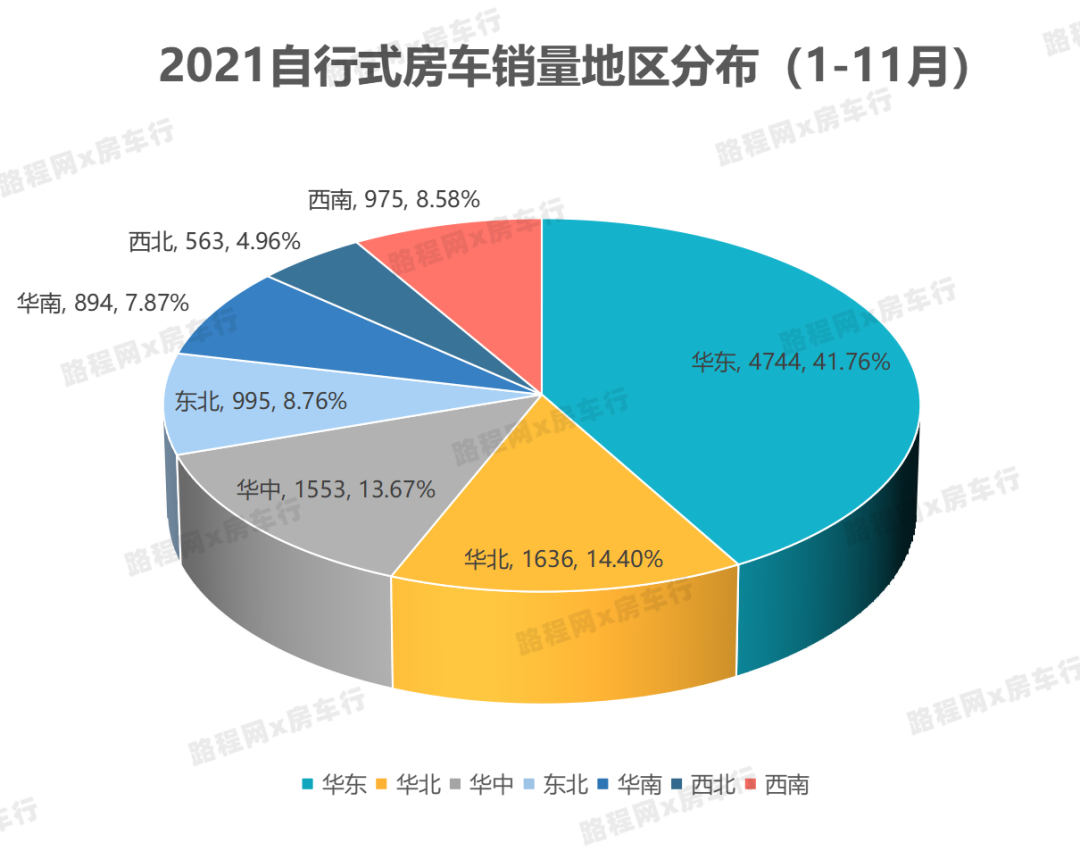 从自行式房车销量地区分布来看,2021年前十一月,华东地区依旧以4744辆,占比41.76%的销量数据遥遥领先,房车展会是成交的主要平台,通过今年由路程网x房车行主办的三场国际型房车展不难发现,到场参展观众大多来自于华东地区,华东房车市场潜力巨大;