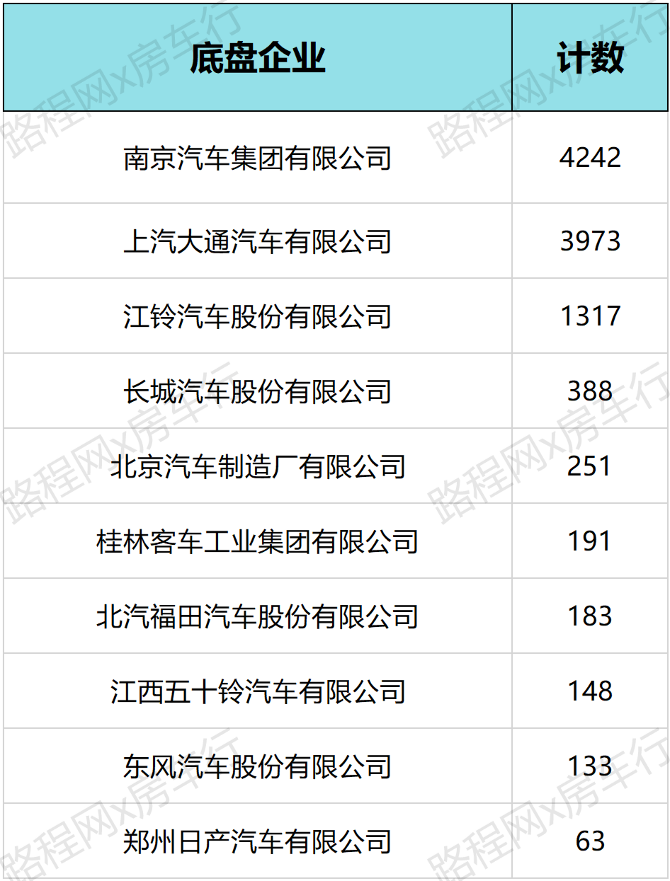 自行式房车底盘方面,南京依维柯与上汽大通分别以4242辆、3973辆位列底盘企业断层一、二名,成为更多房车改装厂中意的选择;江铃底盘则以1317辆名列第三。