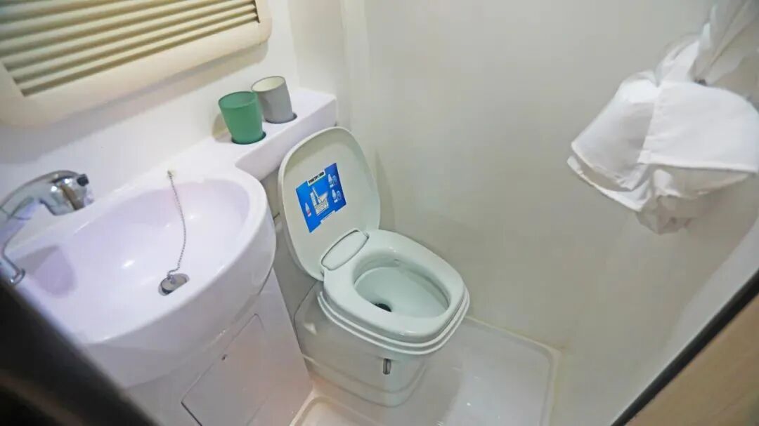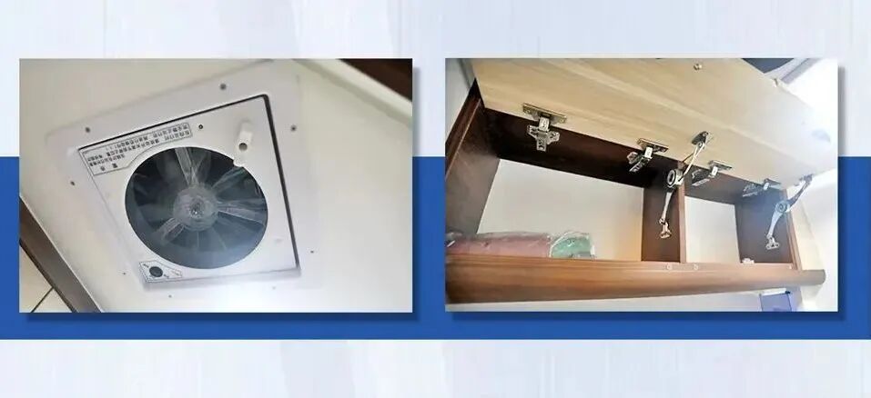 卫浴区位于休息区右侧,配有洗手池、抽拉水龙头、赛特福德盒式马桶、淋浴器等设施,能够满足日常卫浴洗漱需求;上方吊柜可以存放毛巾、浴巾等洗浴用品;顶部排气扇打开后可加快空气流通。