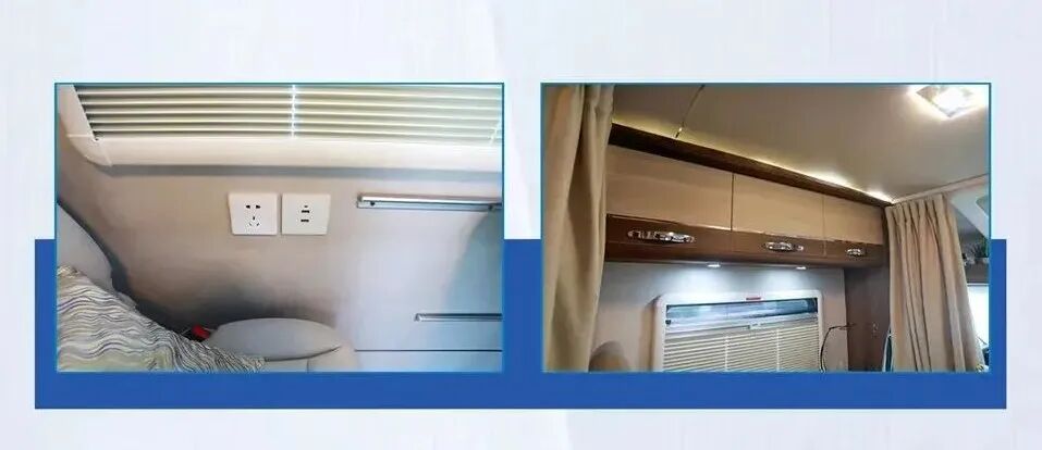 尾部休息区设有纵床,尺寸为1900x1090mm,可满足多人休息,床垫采用高密度海绵材料,睡起来非常柔软舒服;床的上方装有车载直流变频空调、吊柜,用来满足温度调节及储物的需求;侧面的大尺寸外推窗,方便观赏户外风景。
