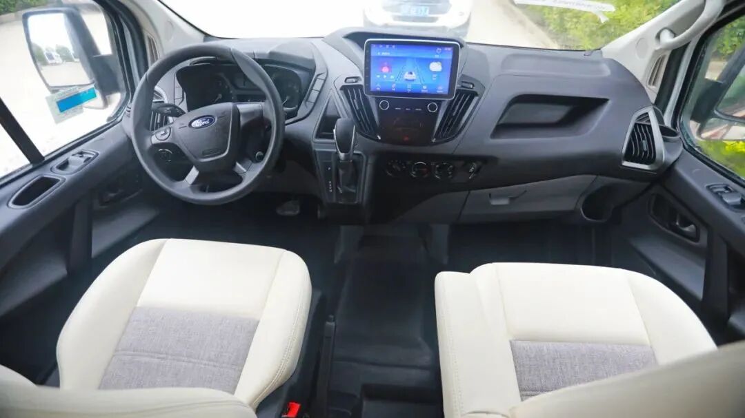 进入驾驶室,可以看到新车采用贯通式设计,有更好的通过性;正副驾驶座选用皮革包覆座椅,让行车更加舒适,副驾驶座椅还可旋转,与后方组成更大的空间;中央位置配有中控娱乐屏,集成各类娱乐、交互功能,并且内置地图导航系统,帮助驾驶员更好的行车。