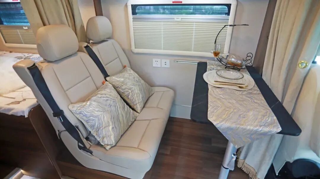 会客区位于驾驶区后方,采用双人并排卡座设计(1480x1000mm),皮革包覆商务座椅,提升了乘坐舒适性;中间位置设有圆角餐桌(桌面可拆卸),可用于日常就餐;卡座侧面还有一个比较大的外推窗,有很好的通风采光效果,内侧还设有隐私帘,保障车内隐私。