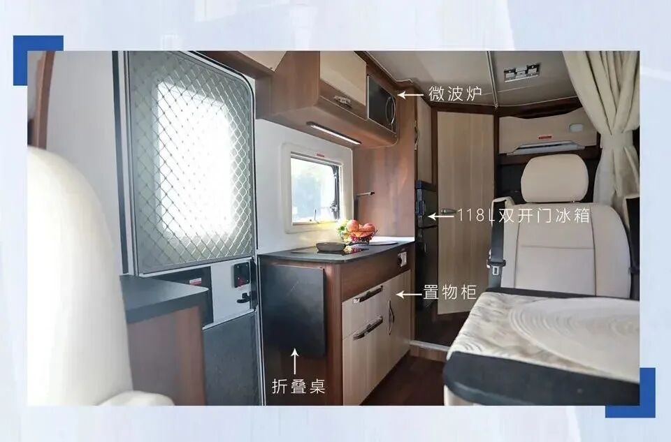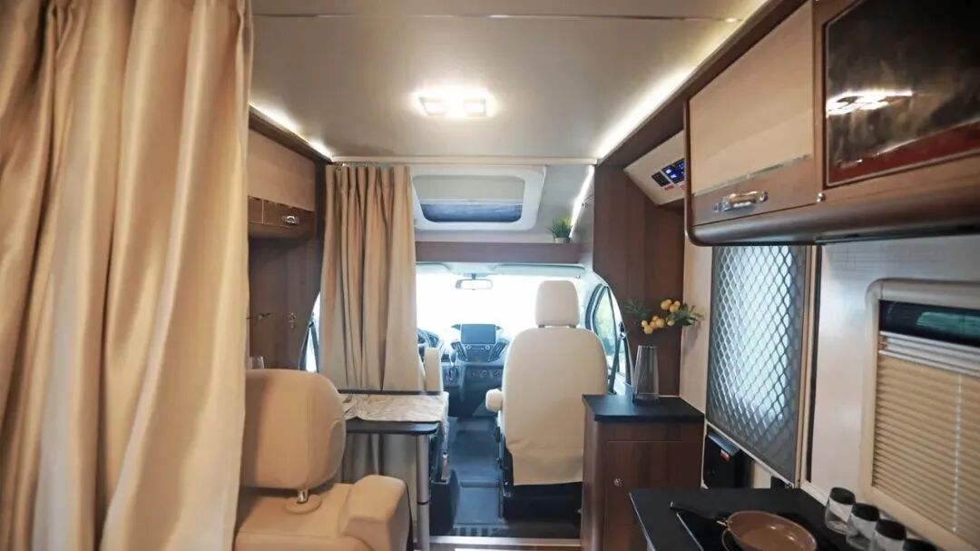 后车生活区采用欧式设计风格,搭配原木家具,营造出温馨的旅居氛围;暖色灯光的照明系统,在保证车内照明的同时,增添了温暖的气氛。