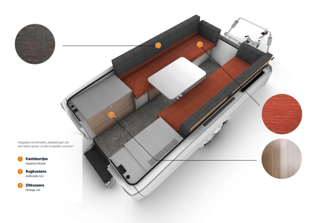 车内生活区结构简洁明了,采用对向沙发卡座+折叠厨房布局,可满足户外旅行的基本需求;内饰采用简约设计风格,红棕色沙发(另有多种颜色可选)和原木色家具组合,同时搭配白色LED照明灯,看起来简洁流畅。