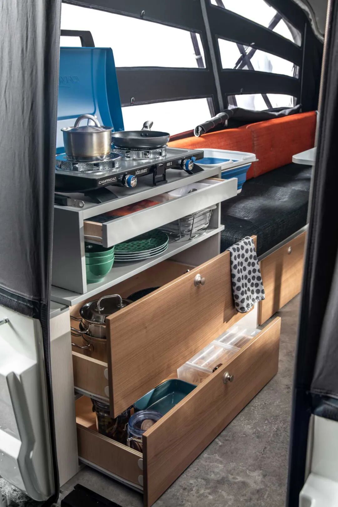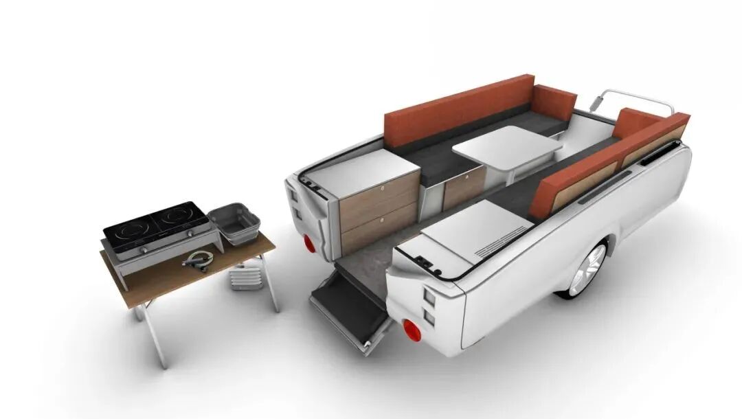 偏爱开放式厨房的车友,还可以将燃气灶拆卸,放置在户外的折叠桌上,享受更宽敞的烹饪空间,同时也不会让车内有油烟味。