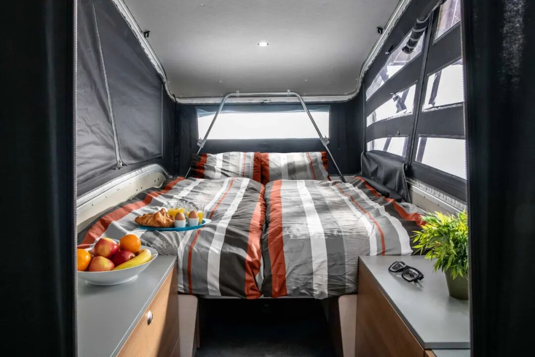 对向沙发可以拼成2050x1600mm双人床,满足户外旅行睡眠休息;床的上方设有支撑结构,睡眠时打开,使车身更加稳固,进而保证睡眠安全;两侧窗户还设有拉链遮帘,保护车内隐私。