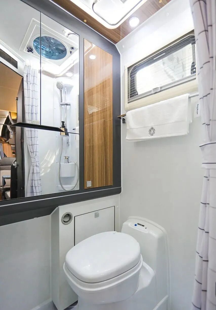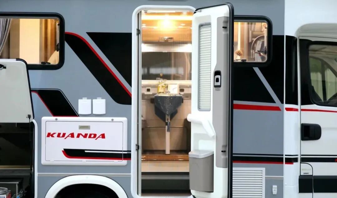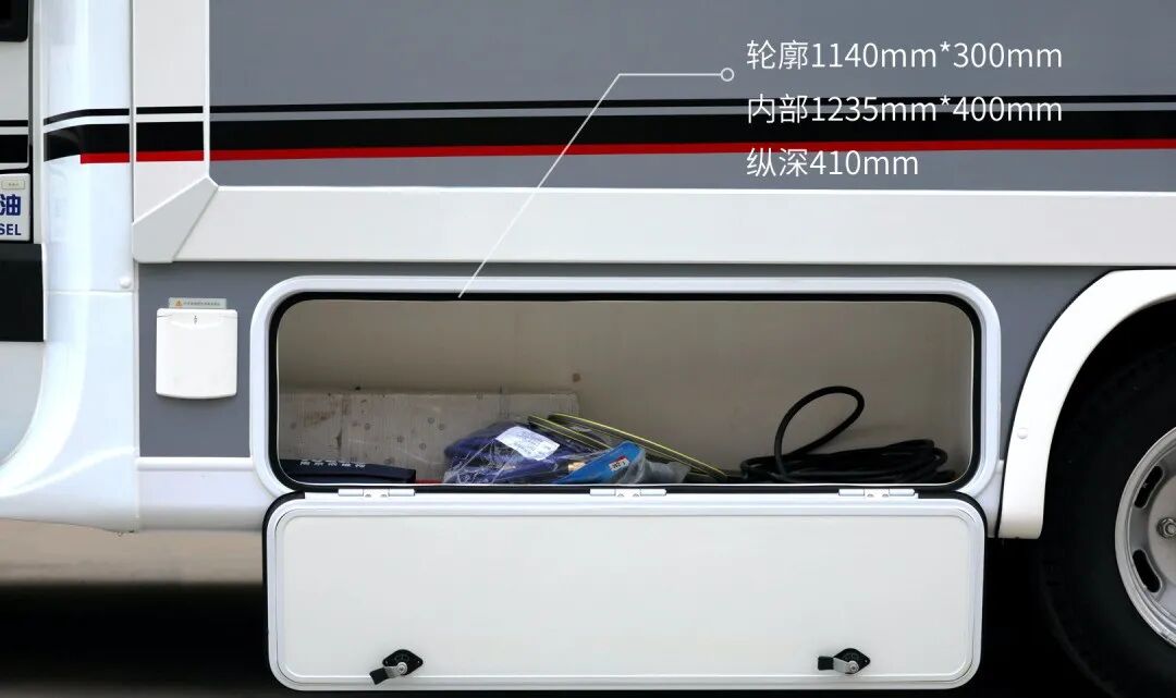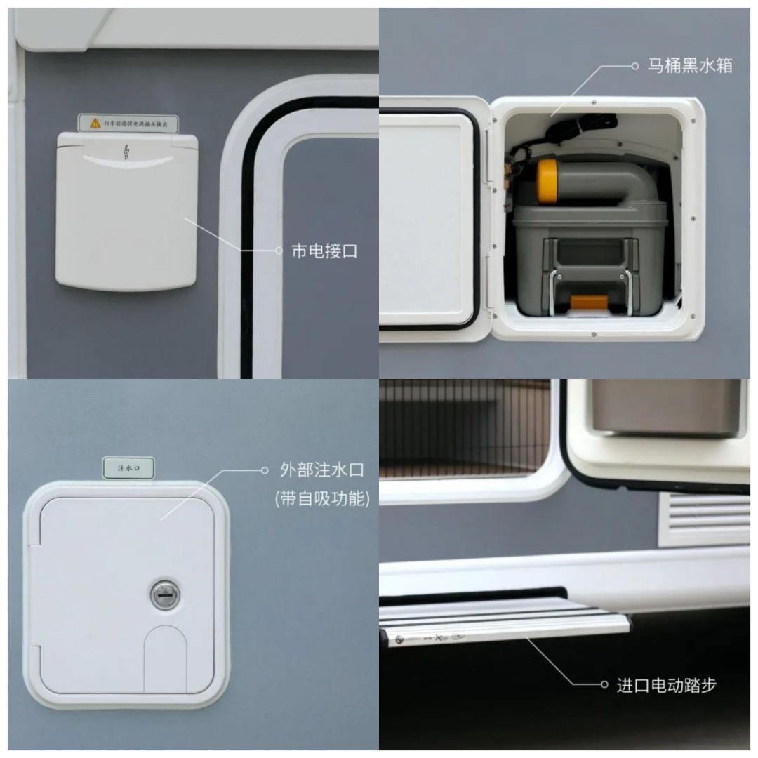 车身外侧配备了齐全的生活设施,包括市电接口、注水口、进口电动踏步、外部电源口及10米电源线、外部淋浴器、折叠桌板、外置220V电源插座、电动平衡支腿等设施,为旅行生活提供了方便。