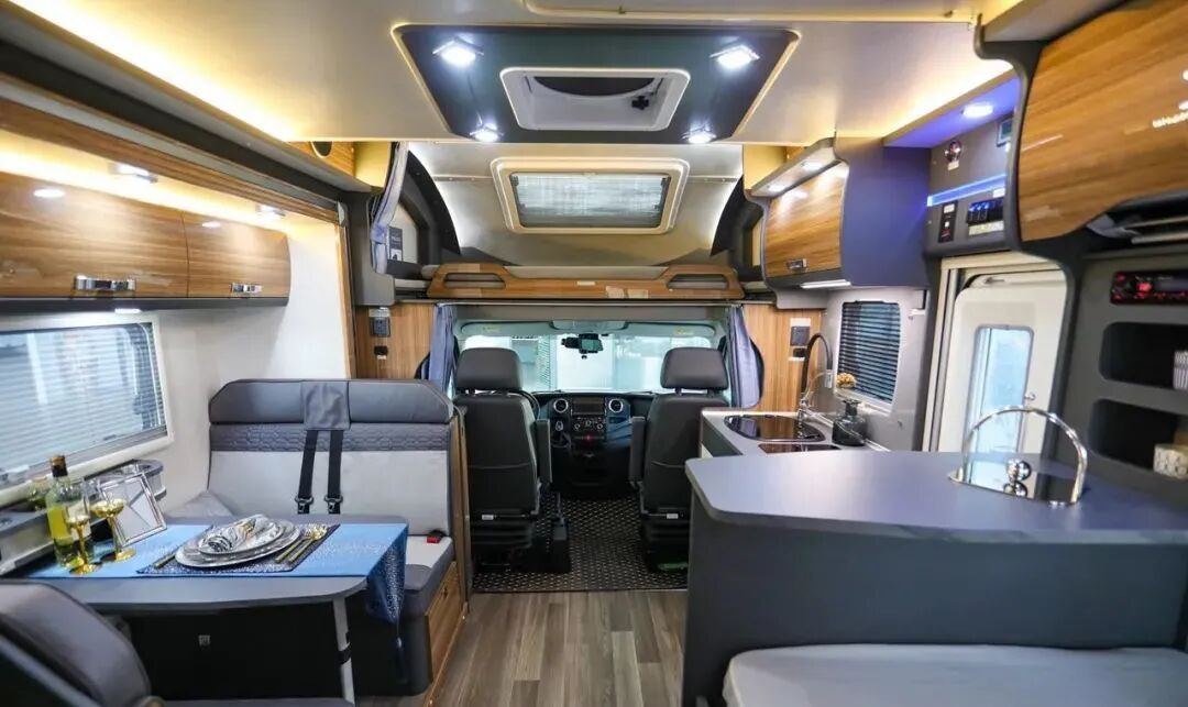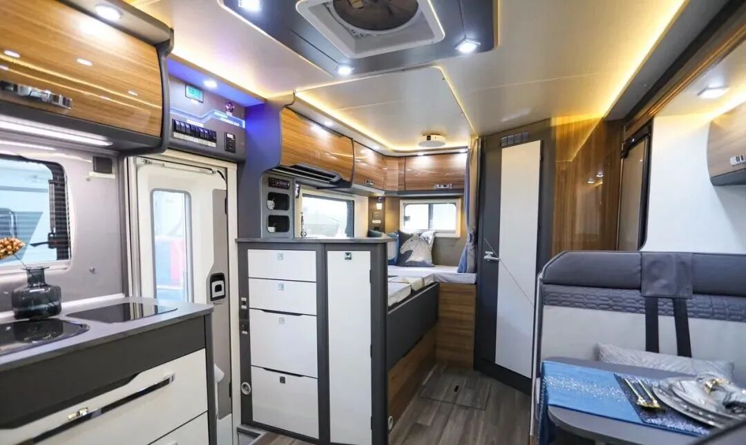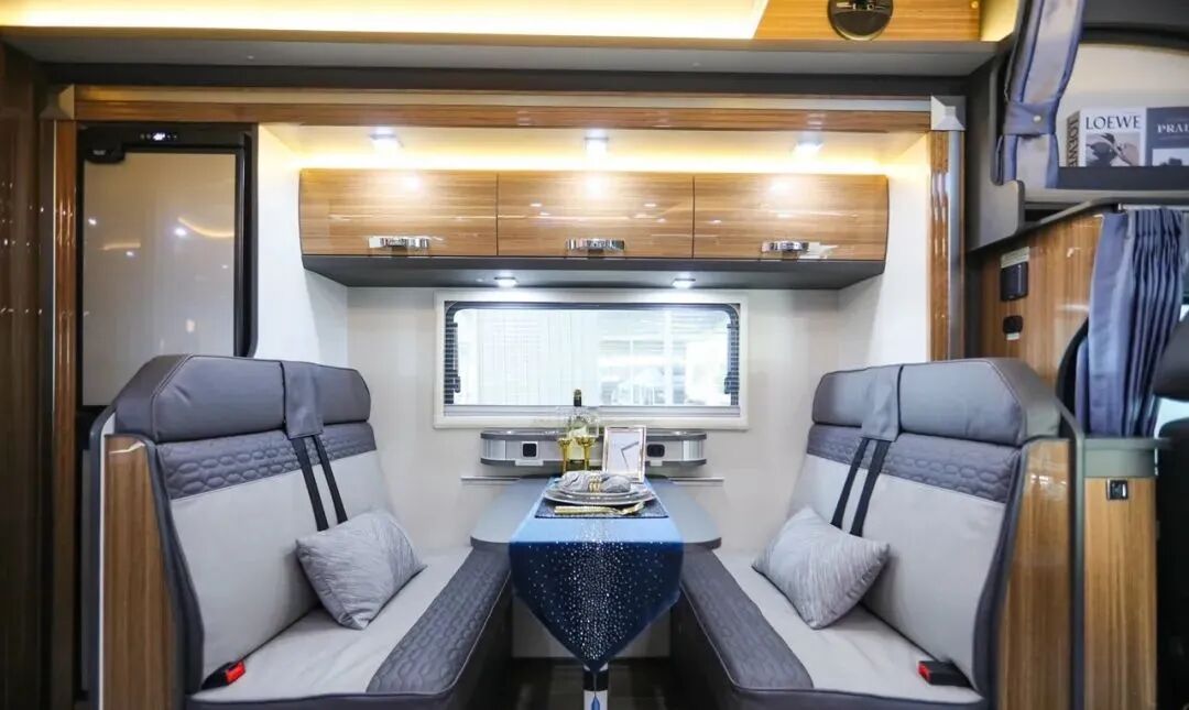 内饰采用胡桃木色系设计,搭配12V LED照明系统,简洁而富有质感;家具采用统一色系的E0级环保家具、房车专用地板革,保证了内饰的整体性,并且环保无污染;带有纱窗遮光帘的双层保温侧窗,加强了整车的保温隔热性能。