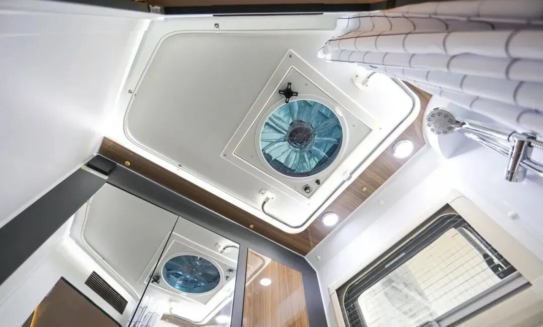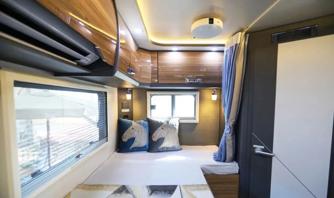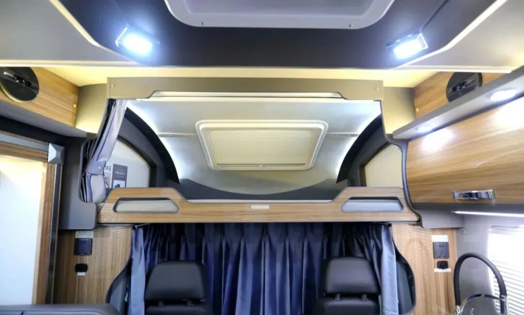 额头双人床尺寸为1950x1400mm,可满足多人睡眠休息;床铺顶部设置了大尺寸弧形天窗,两侧设置小尺寸车窗,保证车内采光通风;侧面还非常贴心的设置了床帘,保证睡眠空间的私密性。