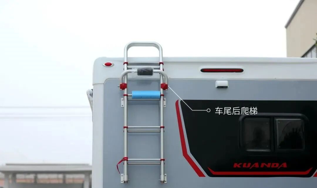 尾部备胎舱、倒车影像及雷达的设置,为日常行车提供了安全保障;车尾还设置了折叠爬梯,打开后可轻松爬到车顶。