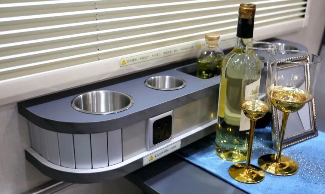 卡座侧面设置了特色固定杯架,带有纸巾盒、220V插座、USB插座等设施,为日常娱乐聊天提供了方便。