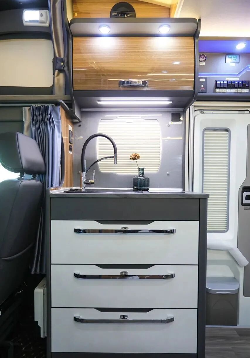 会客区位于驾驶室后方,设有对向沙发卡座,用于日常乘坐休息,驻车后可打开拓展机构,拥有更大内部空间;卡座配备了安全带,行车时乘坐也很安全;中间位置设有可折叠餐桌,可与沙发拼成1050x1800mm床铺,增加车内睡眠空间;卡座上方配备吊柜、双向MAXFAN换气扇,满足储物、通风等需求。