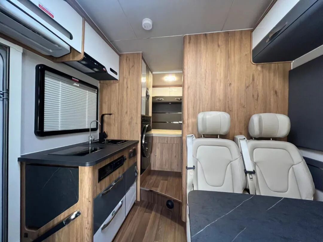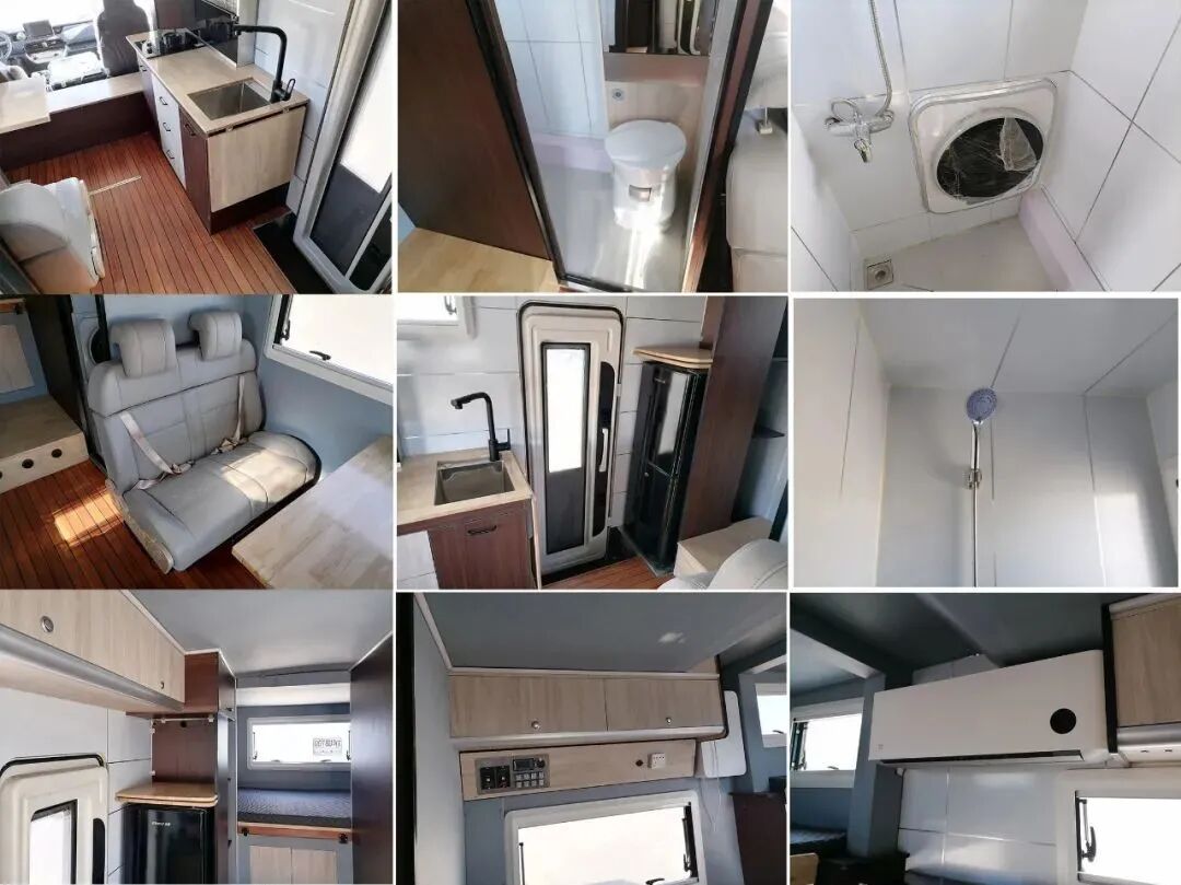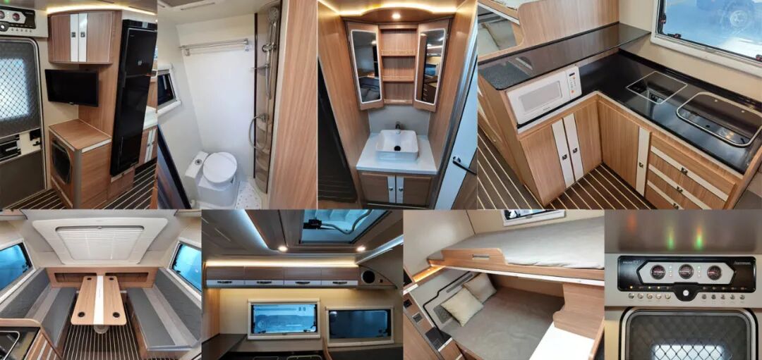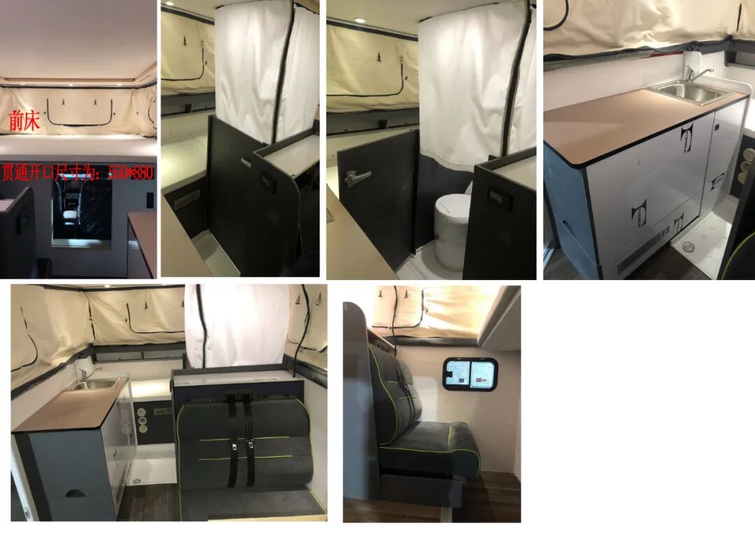 该车配备卧具、厨具、卫生设施(马桶为固定马桶,不可拆卸)等旅居生活设施,用于旅行宿营;其他说明:该车顶棚可整体升起并且只可在未行驶状态下开启升降,牵引挂车时,中置轴挂车的牵引杆深入量为50mm,中置轴牵引杆连接器最大负荷为100kg;说明:车内高度(车厢顶棚升起时,车厢地板到车厢内顶蓬的最小距离)为1802mm,可选装ETC。
