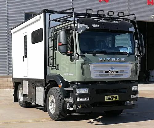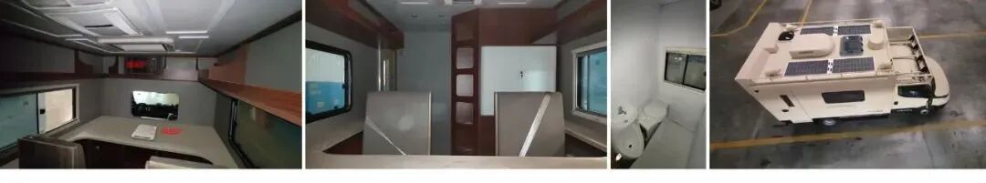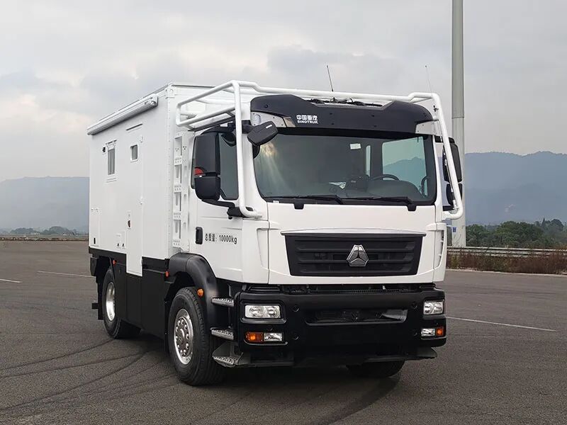 发动机最大净功率199kW;侧防护为裙板结构,材质为6061铝合金,后防护材质为Q355,截面尺寸:100X40(高x宽,单位:mm),离地高度为:350(mm),连接方式为:螺栓连接;ABS系统控制方式:单参数控制(4S/4M);车厢内部配备桌椅、床、厨具、马桶、淋浴等生活设施;车厢后顶部中间灯具仅限人员在野外非道路状况下工作和生活照明使用;可选装ETC车载装置。