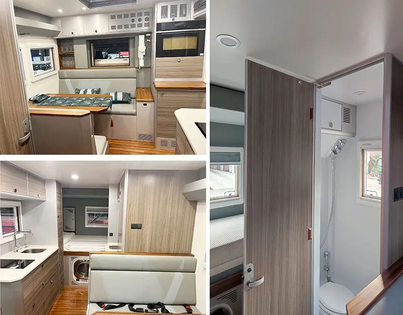 1.该车为非乘用车,行驶过程中不载人,车厢顶部封闭,不可开启;2.牵引杆深入量为50mm,连接器最大负荷100kg;3.厢体内安装有床铺、沙发、桌柜、厨具、卫生设施,给排水设施等旅居专用设备;4.侧后防护为裙边结构,材料为Q235,后下部离地高度340mm;5.选装内部装置布局,遮阳棚为选装件,装遮阳棚时宽度为2470mm,不装遮阳棚时宽度为2385mm。